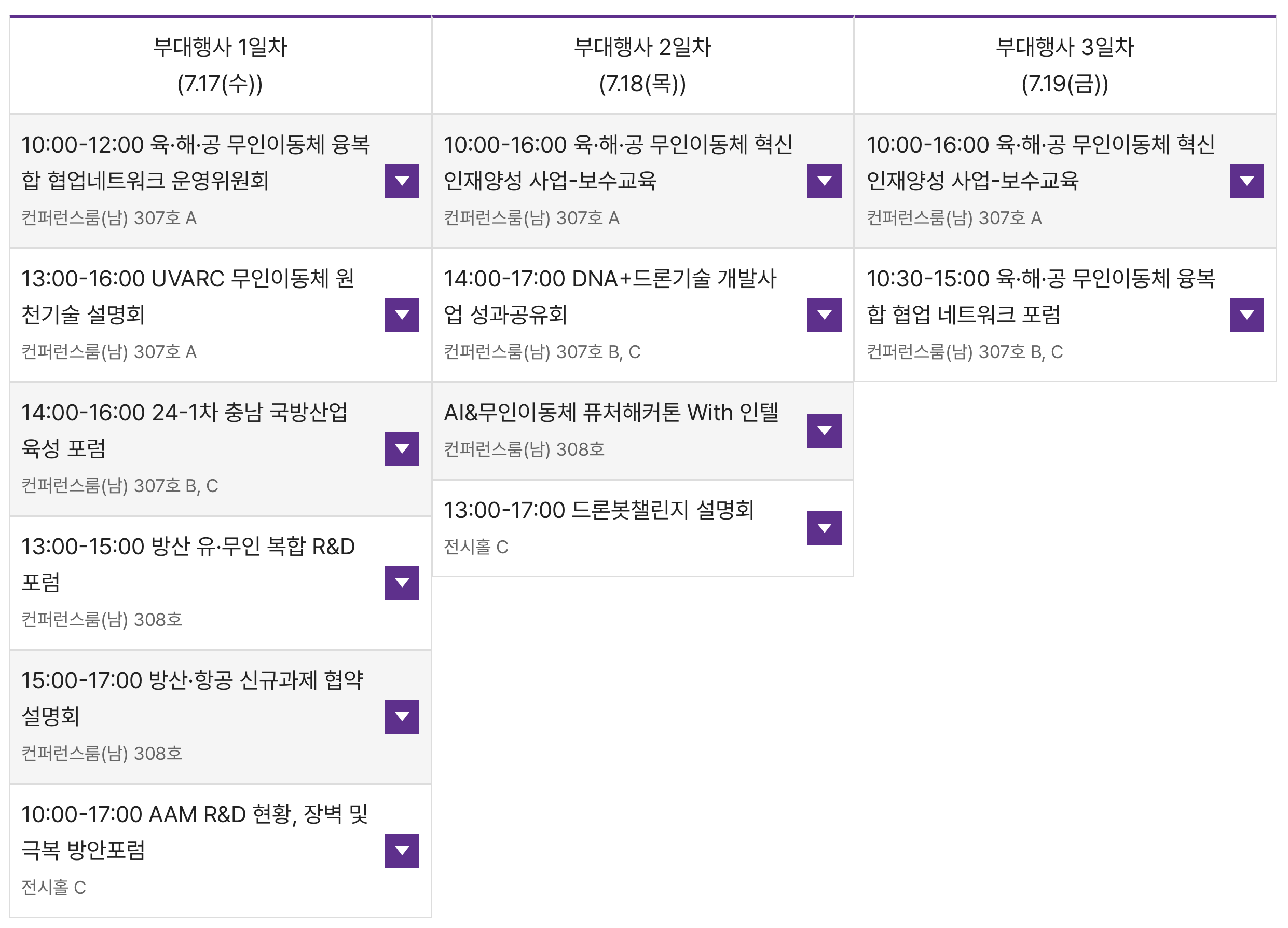 그리고 UWC 부대행사도 다양하게 준비되어 있습니다. 육·해·공 무인이동체 융복합 협업네트워크 운영위원회, UVARC 무인이동체 원천기술 설명회, 충남 국방산업 육성 포럼, 방산 유·무인 복합 R&D 포럼, 방산·항공 신규과제 협약 설명회, AAM R&D 현황, 장벽 및 극복 방안포럼, 육·해·공 무인이동체 혁신 인재양성 사업 보수교육, DNA+드론기술 개발사업 성과공유회, AI&무인이동체 퓨처해커톤 with 인텔, 드론봇챌린지 설명회 등 다양한 정보를 확인해 볼 수 있는 부대행사들이 3일 동안 계속 펼쳐지니 관심있는 분야를 확인해 보시고 들어보시면 좋을 것 같습니다.