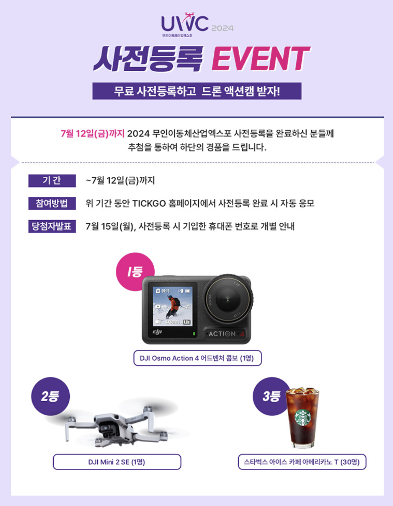 2024 무인이동체산업엑스포 사전등록 이벤트는 틱고 홈페이지에서 등록을 하시면 됩니다. 7월 12(금)까지 진행하는데요. 경품으로 1등 DJI Osmo Action 4 어드벤처 콤보, 2등으로 DJI Mini 2 Se, 3등으로 스타벅스 아이스 카페 아메리카노 Tall 기프티콘이 있습니다.