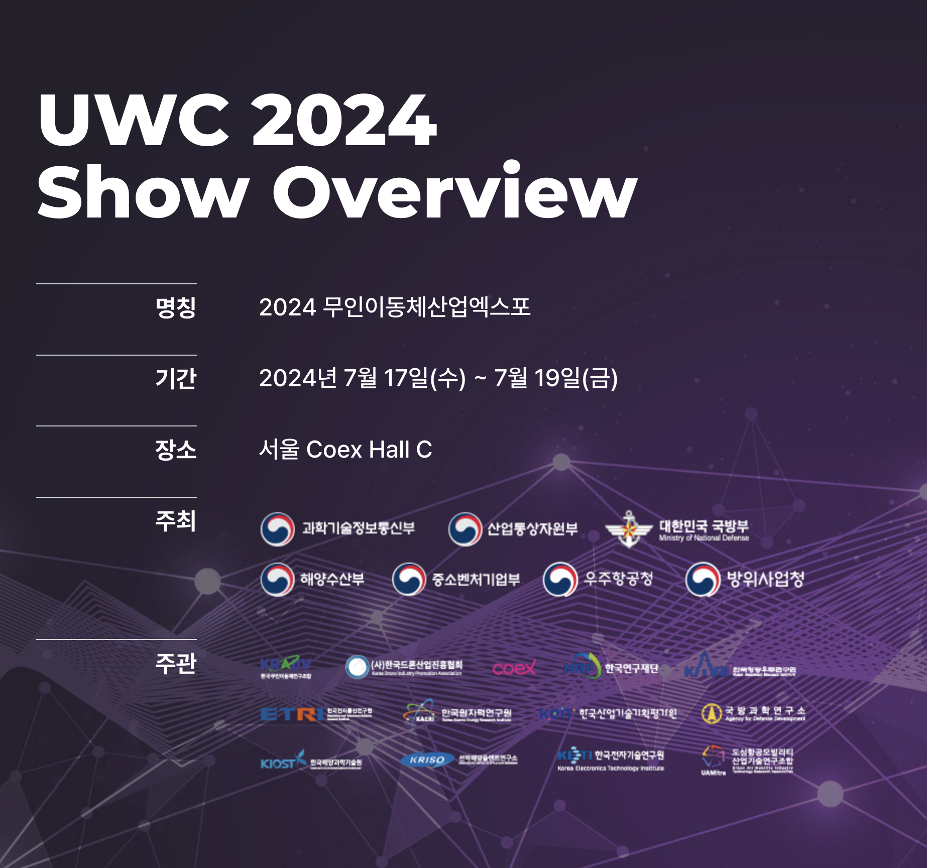그리고 UWC 부대행사도 다양하게 준비되어 있습니다. 육·해·공 무인이동체 융복합 협업네트워크 운영위원회, UVARC 무인이동체 원천기술 설명회, 충남 국방산업 육성 포럼, 방산 유·무인 복합 R&D 포럼, 방산·항공 신규과제 협약 설명회, AAM R&D 현황, 장벽 및 극복 방안포럼, 육·해·공 무인이동체 혁신 인재양성 사업 보수교육, DNA+드론기술 개발사업 성과공유회, AI&무인이동체 퓨처해커톤 with 인텔, 드론봇챌린지 설명회 등 다양한 정보를 확인해 볼 수 있는 부대행사들이 3일 동안 계속 펼쳐지니 관심있는 분야를 확인해 보시고 들어보시면 좋을 것 같습니다.