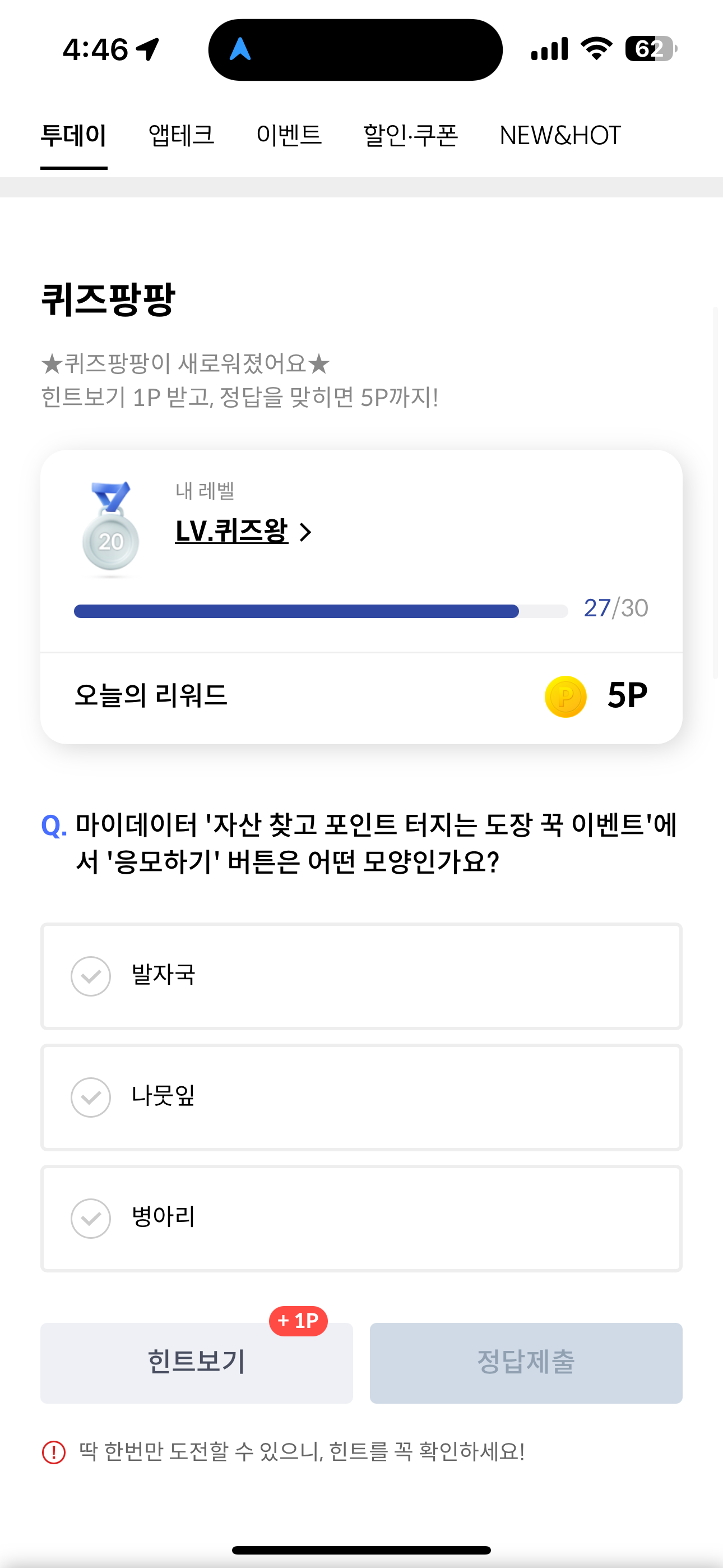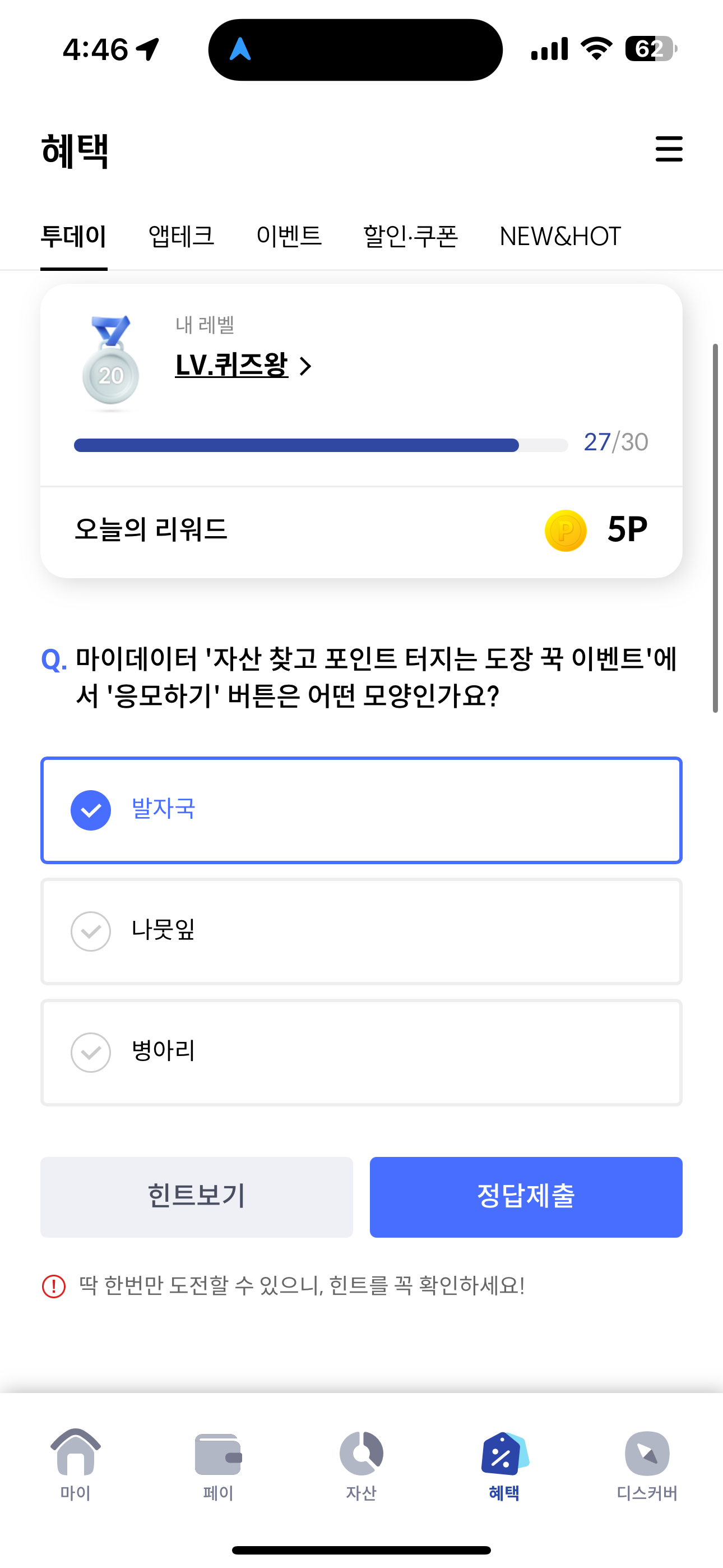 마이데이터 '자산 찾고 포인트 터지는 도장 꾹 이벤트'에서 '응모하기' 버튼은 어떤 모양인가요? 보기는 1. 발자국 2. 나뭇잎 3. 병아리 입니다. 자산을 찾고 도장을 찍으면 되는 이벤트인데요. 도장 이미지를 맞추면 됩니다. 가볍게 자산 찾고 포인트까지 받을 수 있으니 꼭 활용해 보세요