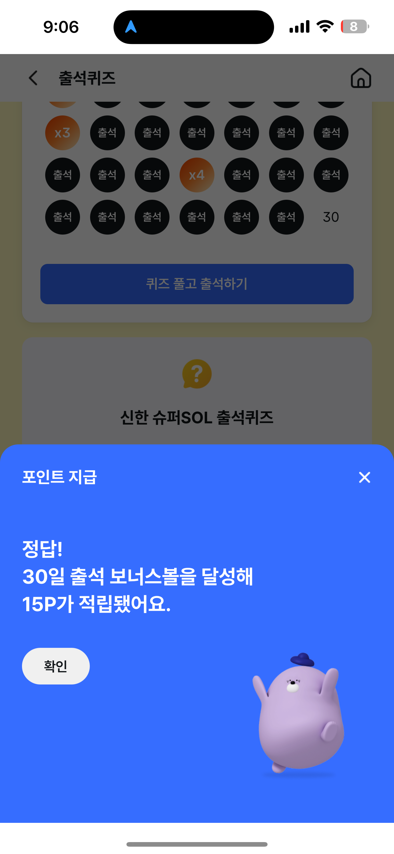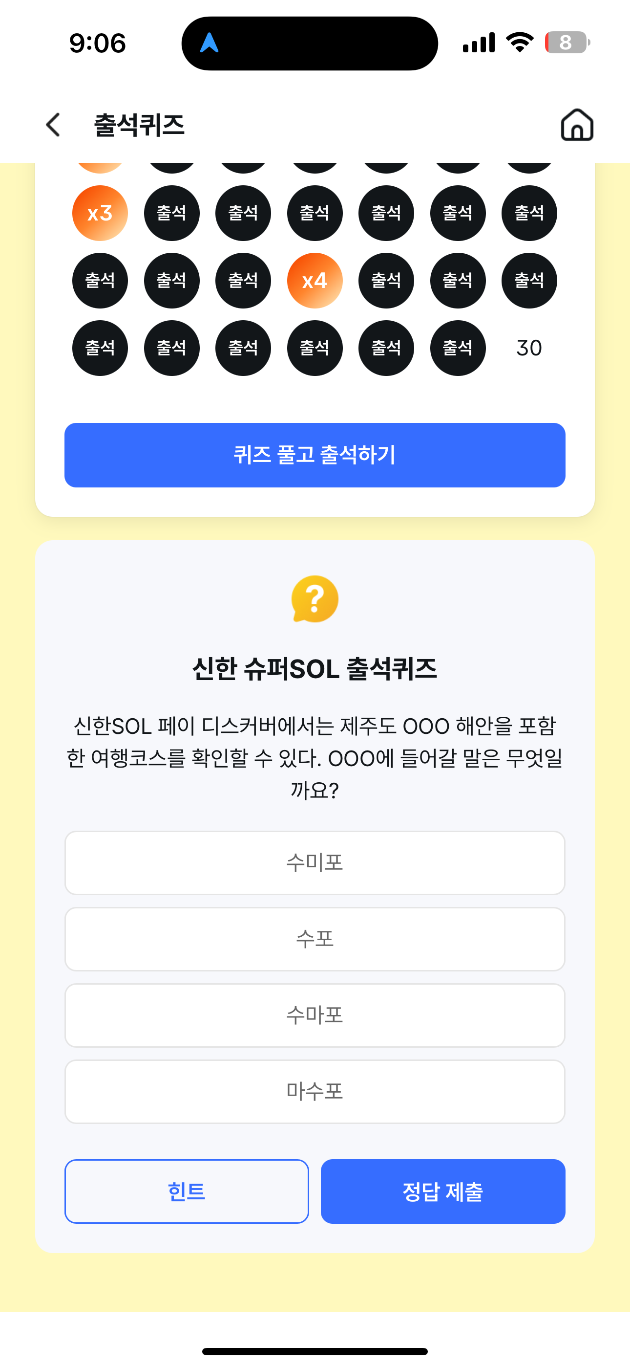 신한 슈퍼SOL 출석퀴즈 정답은 수마포 입니다