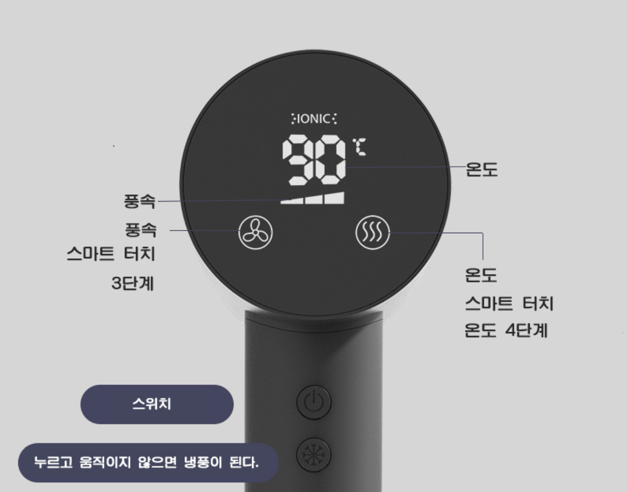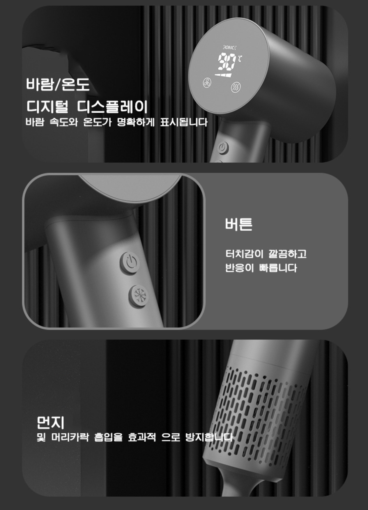 헤어드라이기는 보통 온도는 감으로만 알고 있는데 이건 온도를 정확하게 알 수 있고 컨트롤 상태도 디스플레이로 보여주니 만족스러운 사용이 가능합니다.