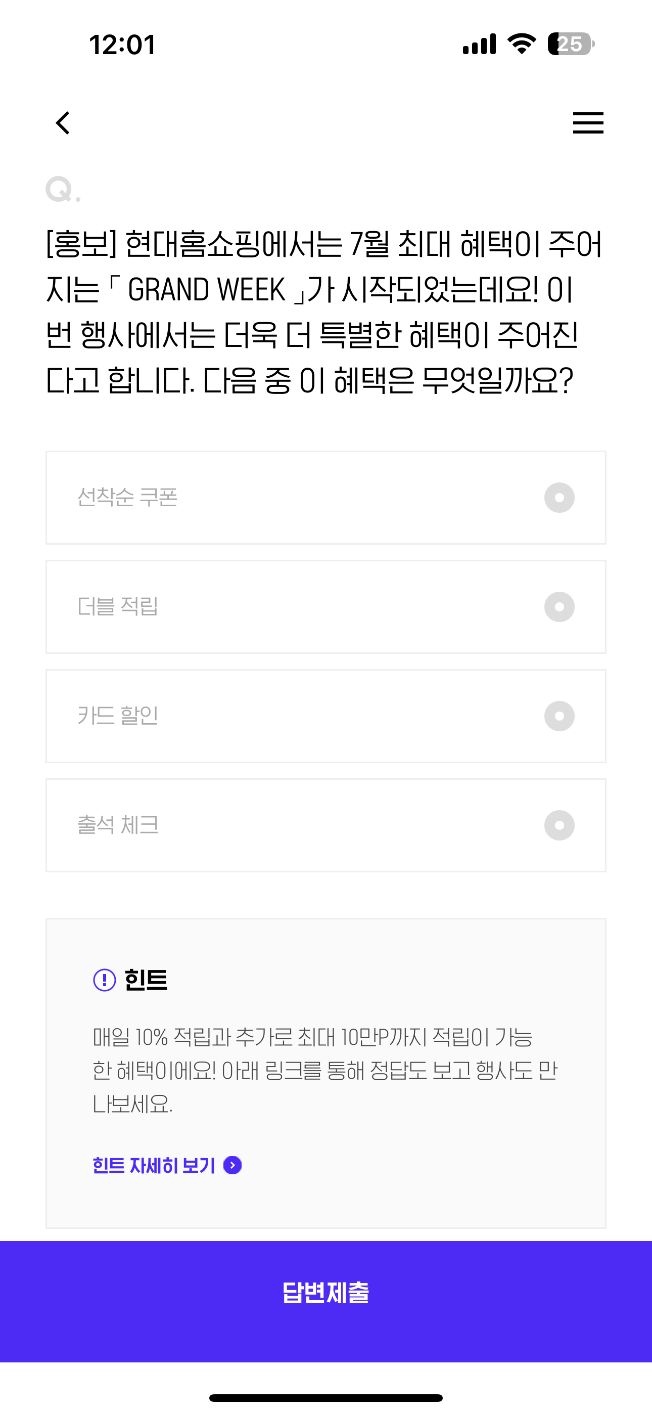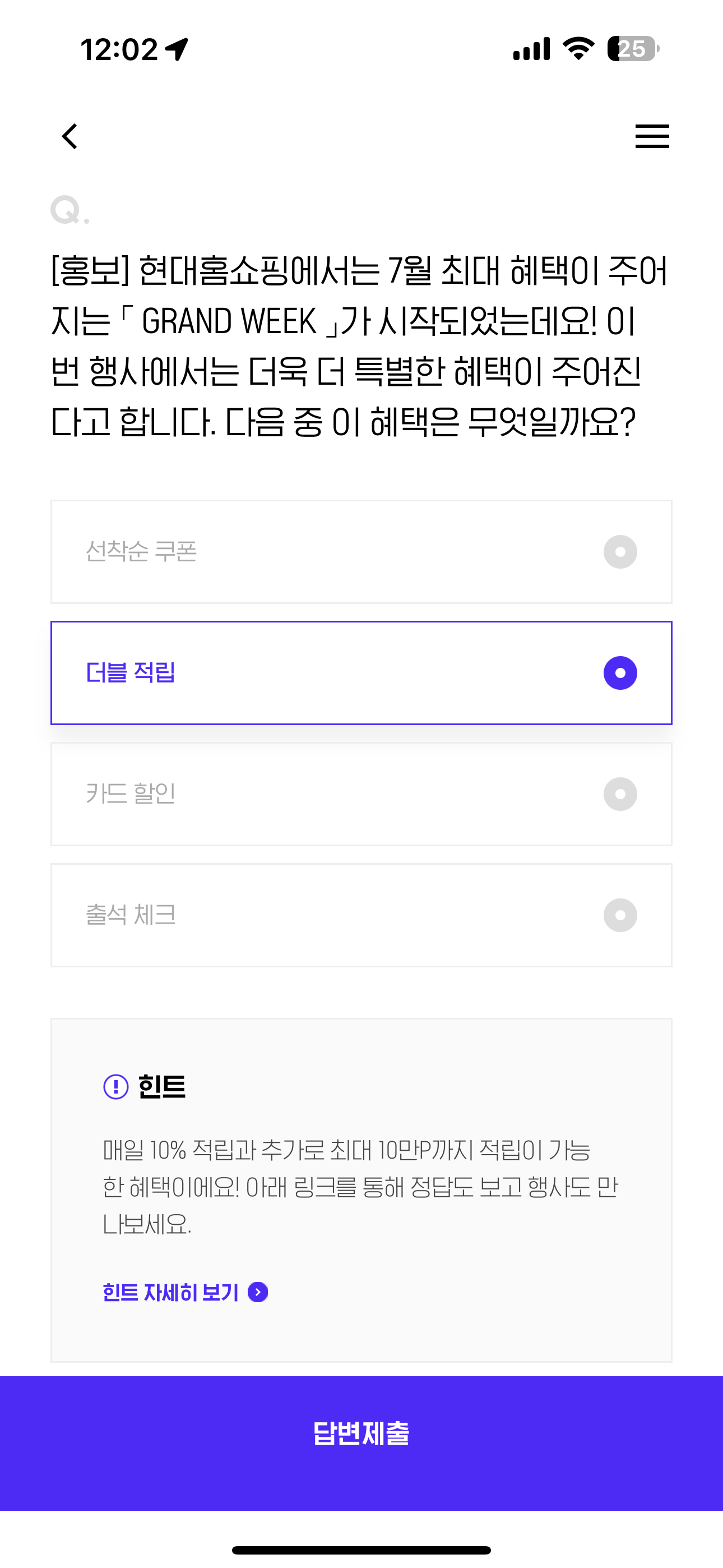 [홍보] 현대홈쇼핑에서는 7월 최대 혜택이 주어지는 「 GRAND WEEK 」가 시작되었는데요! 이번 행사에서는 더욱 더 특별한 혜택이 주어진다고 합니다. 다음 중 이 혜택은 무엇일까요? 보기는 1. 선착순 쿠폰 2. 더블 적립 3. 카드 할인 4. 출석 체크 입니다. 7월 최대 혜택으로 푸짐한 적립을 받을 수 있습니다. 참고해 두세요