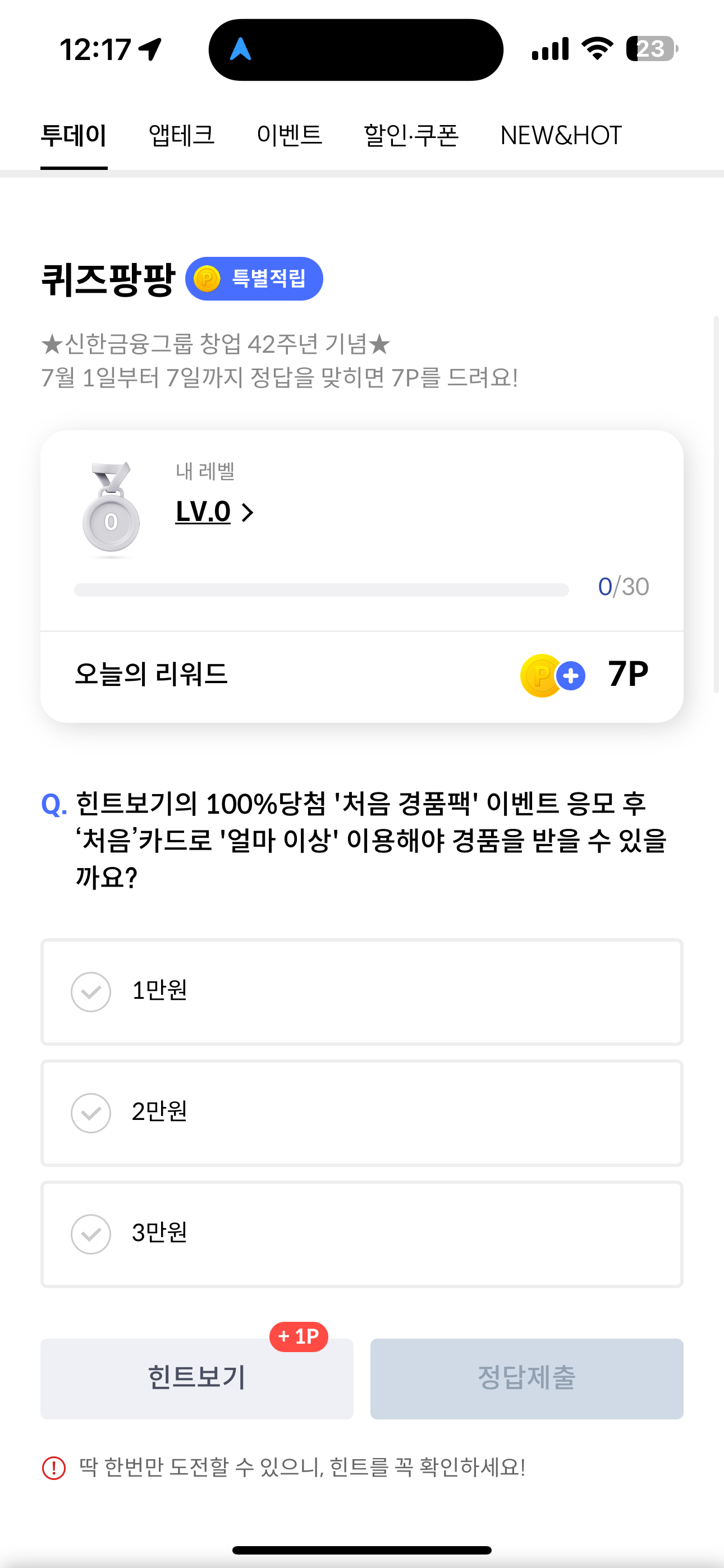 신한카드 퀴즈팡팡 정답은 2만원 입니다