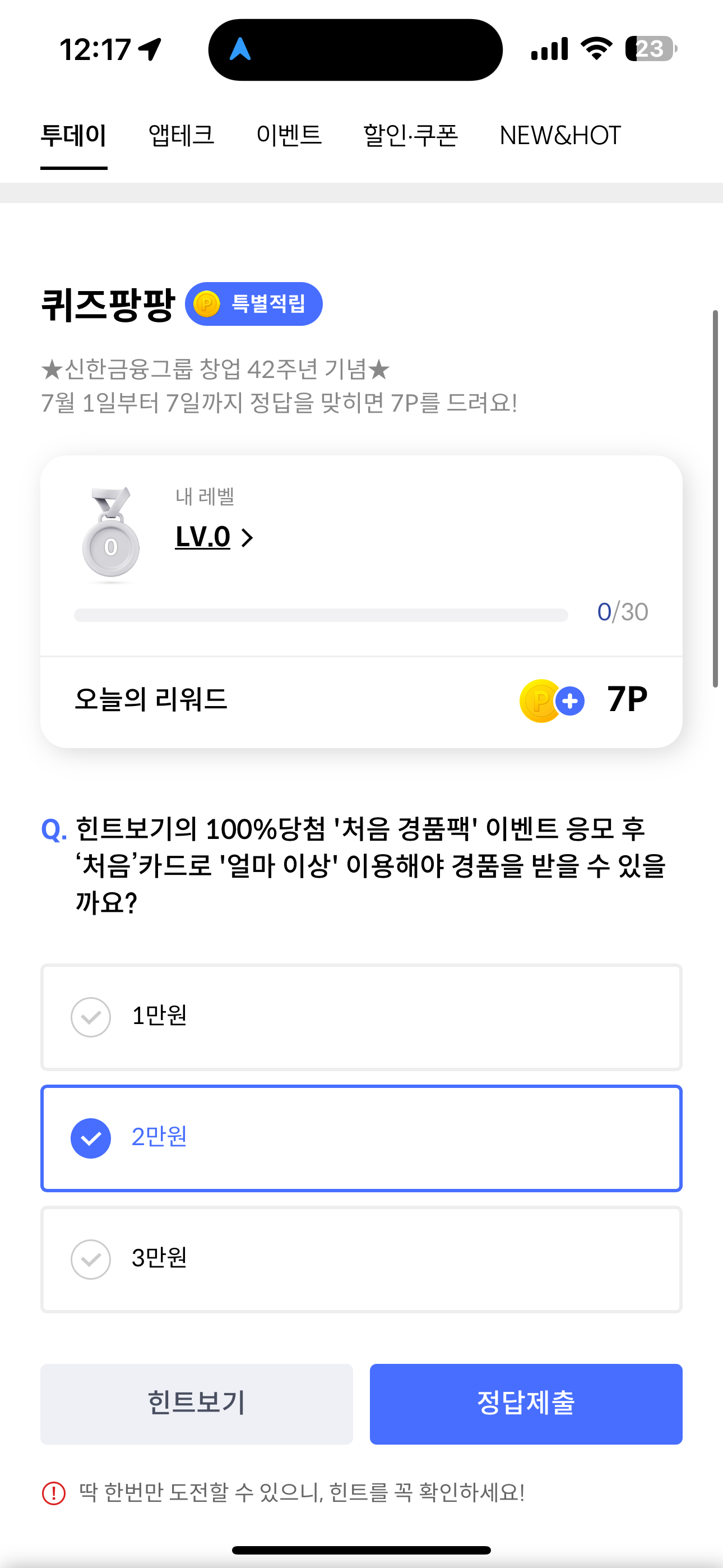 신한카드 퀴즈팡팡 정답은 2만원 입니다