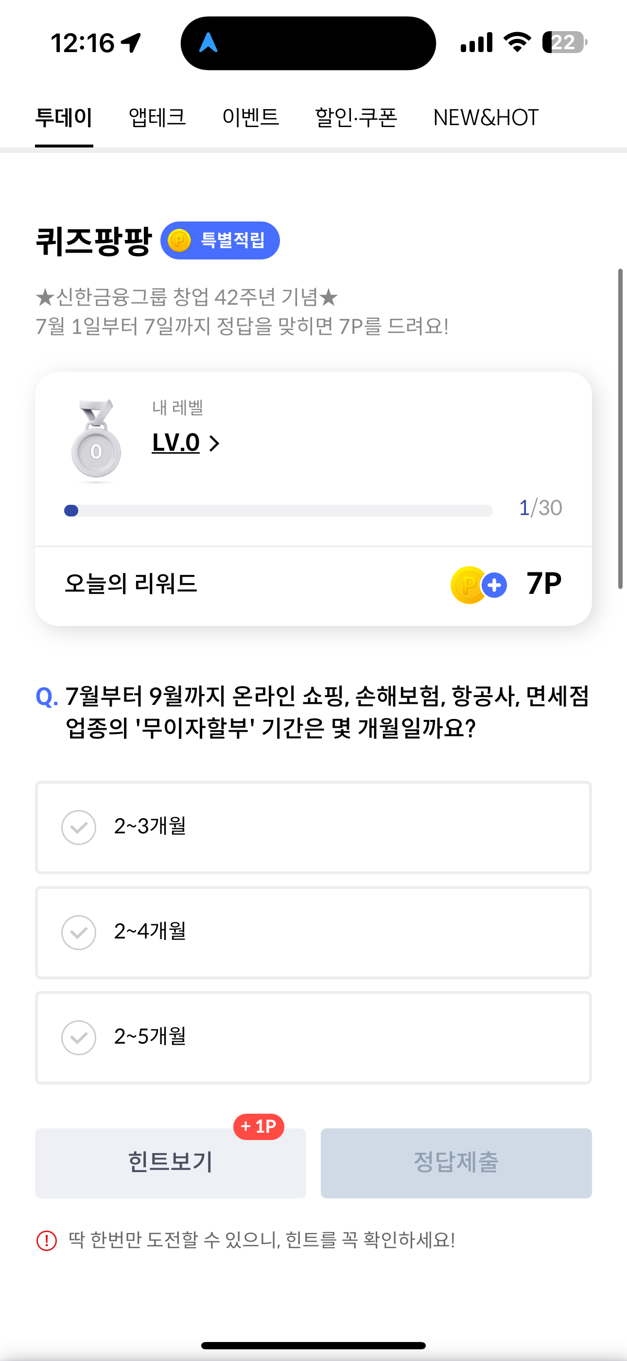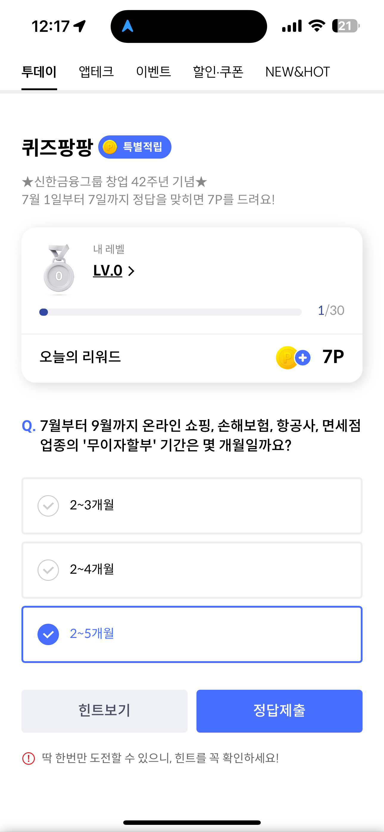신한카드 퀴즈팡팡 정답은 2~5개월 입니다