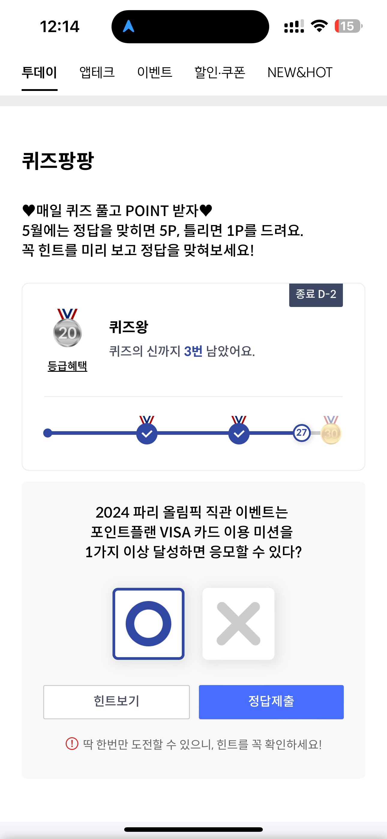신한카드 퀴즈팡팡 5월 29일 정답(2024 파리 올림픽 직관 이벤트는 포인트플랜 VISA 카드 이용 미션을 1가지 이상 달성하면 응모할 수 있다?)