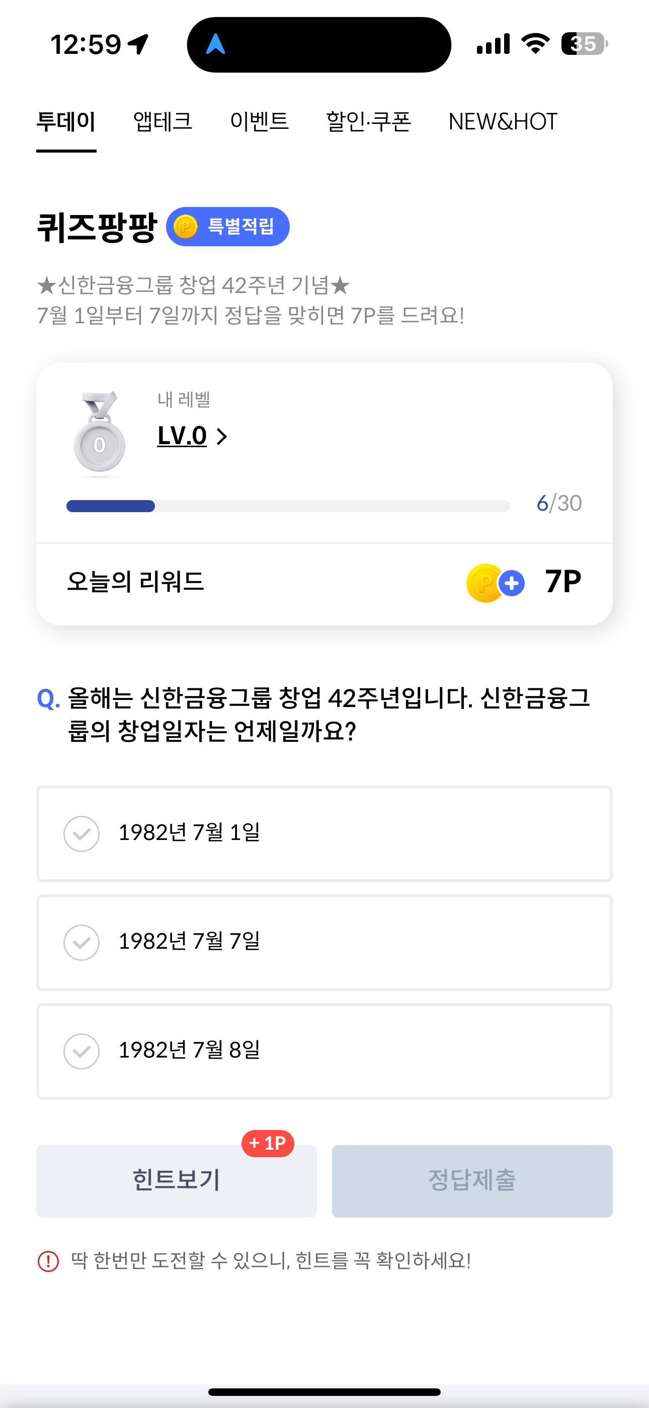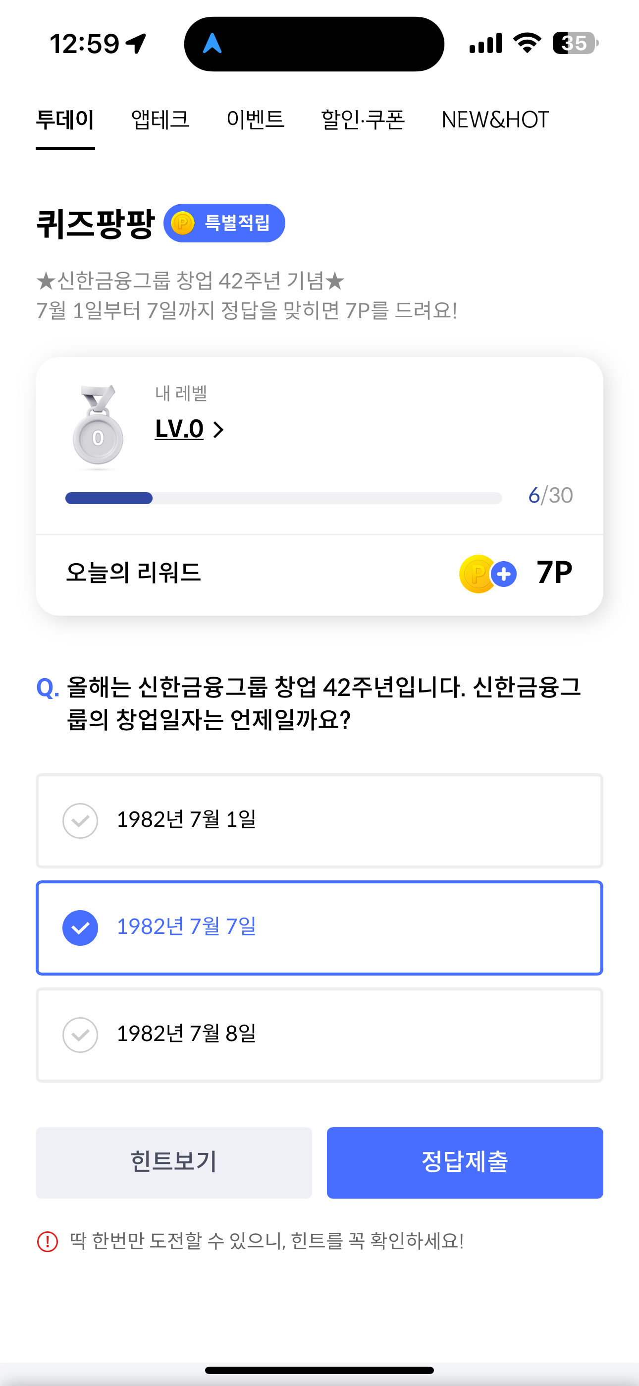신한카드 퀴즈팡팡 정답은 1982년 7월 7일 입니다.