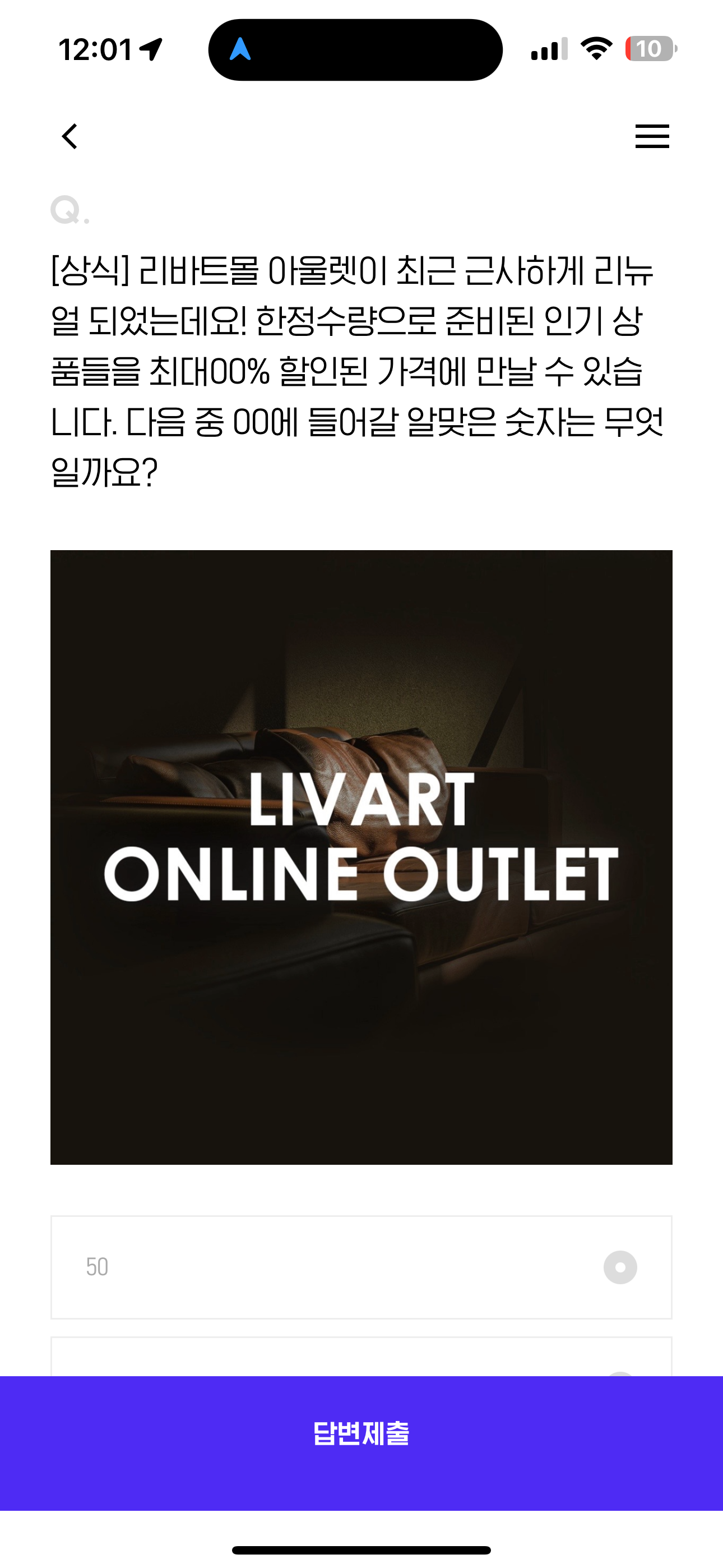 [상식] 리바트몰 아울렛이 최근 근사하게 리뉴얼 되었는데요! 한정수량으로 준비된 인기 상품들을 최대00% 할인된 가격에 만날 수 있습니다. 다음 중 00에 들어갈 알맞은 숫자는 무엇일까요? 보기는 1. 50 2. 60 3. 70 4. 80 입니다 리바트몰 아울렛에서 득템할 수 있는 기회이니 필요한 물건이 있는 분들은 서두르세요
