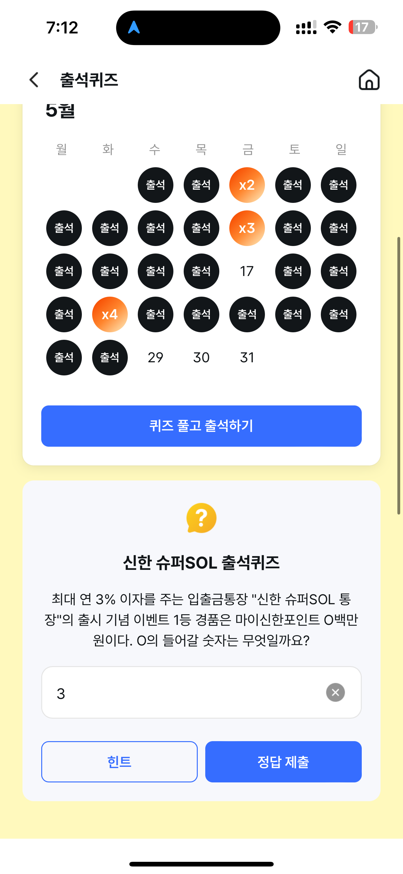 신한 슈퍼SOL 출석퀴즈 정답은 3 입니다