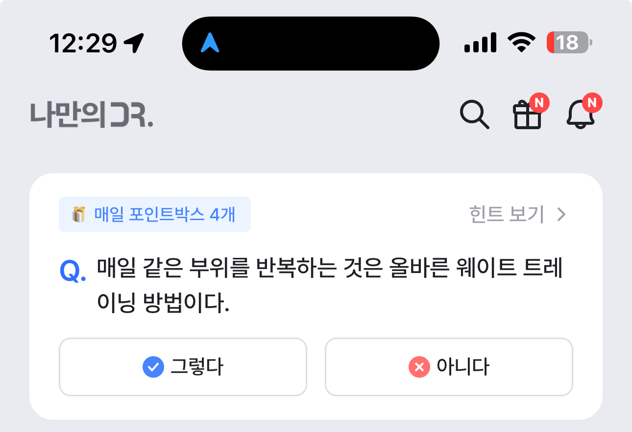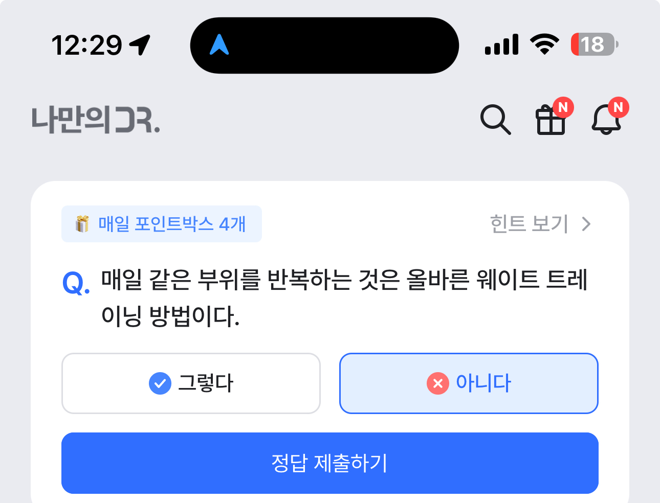 나만의 닥터 퀴즈 7월 8일 정답(매일 같은 부위를 반복하는 것은 올바른 웨이트 트레이닝 방법이다.)