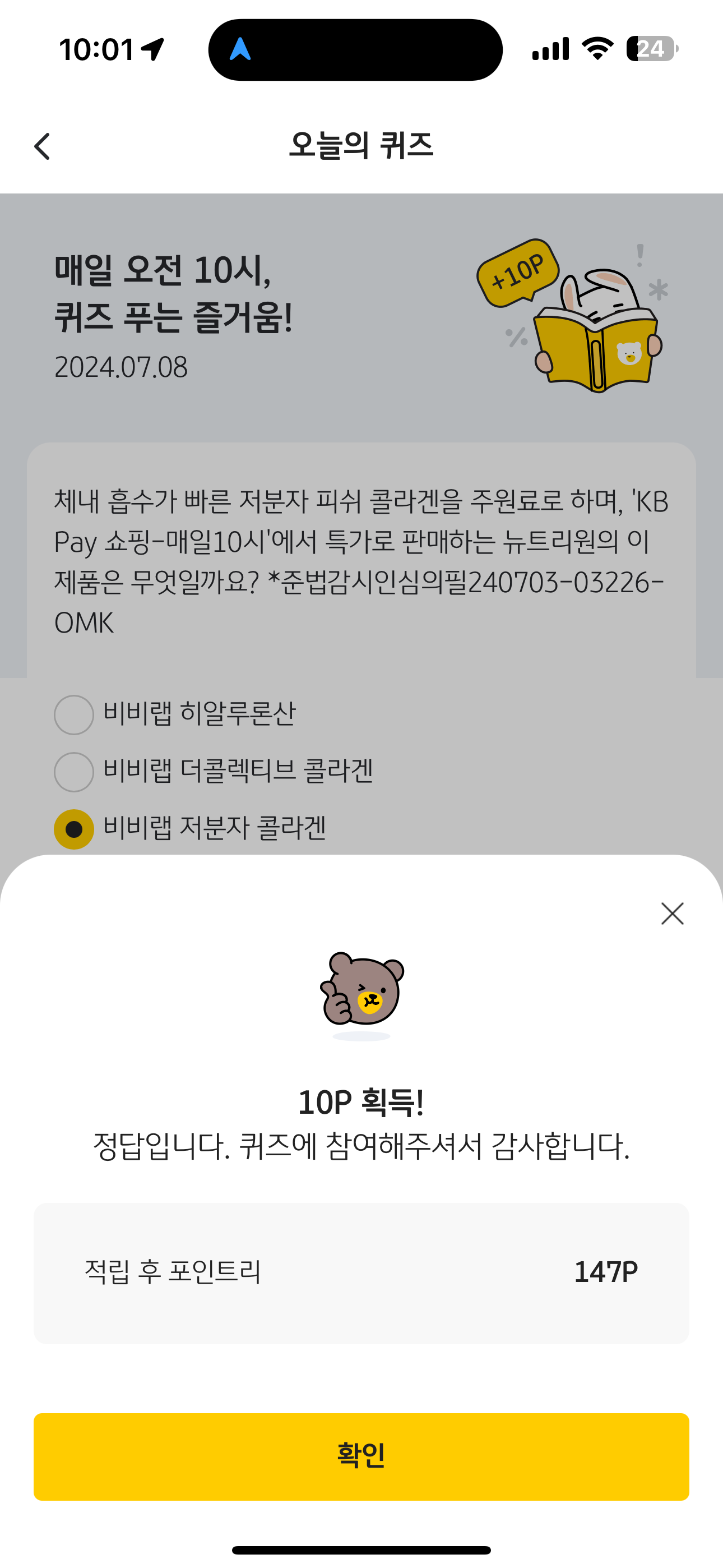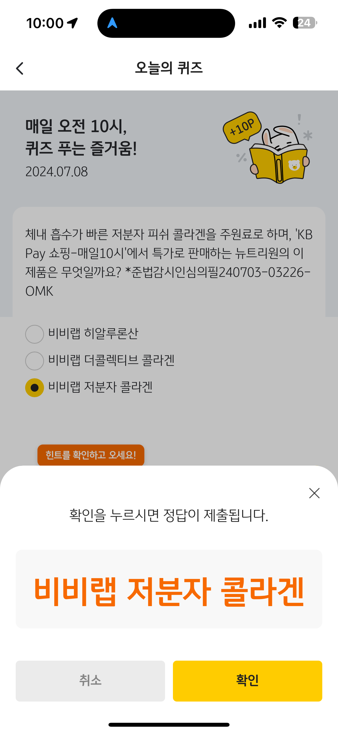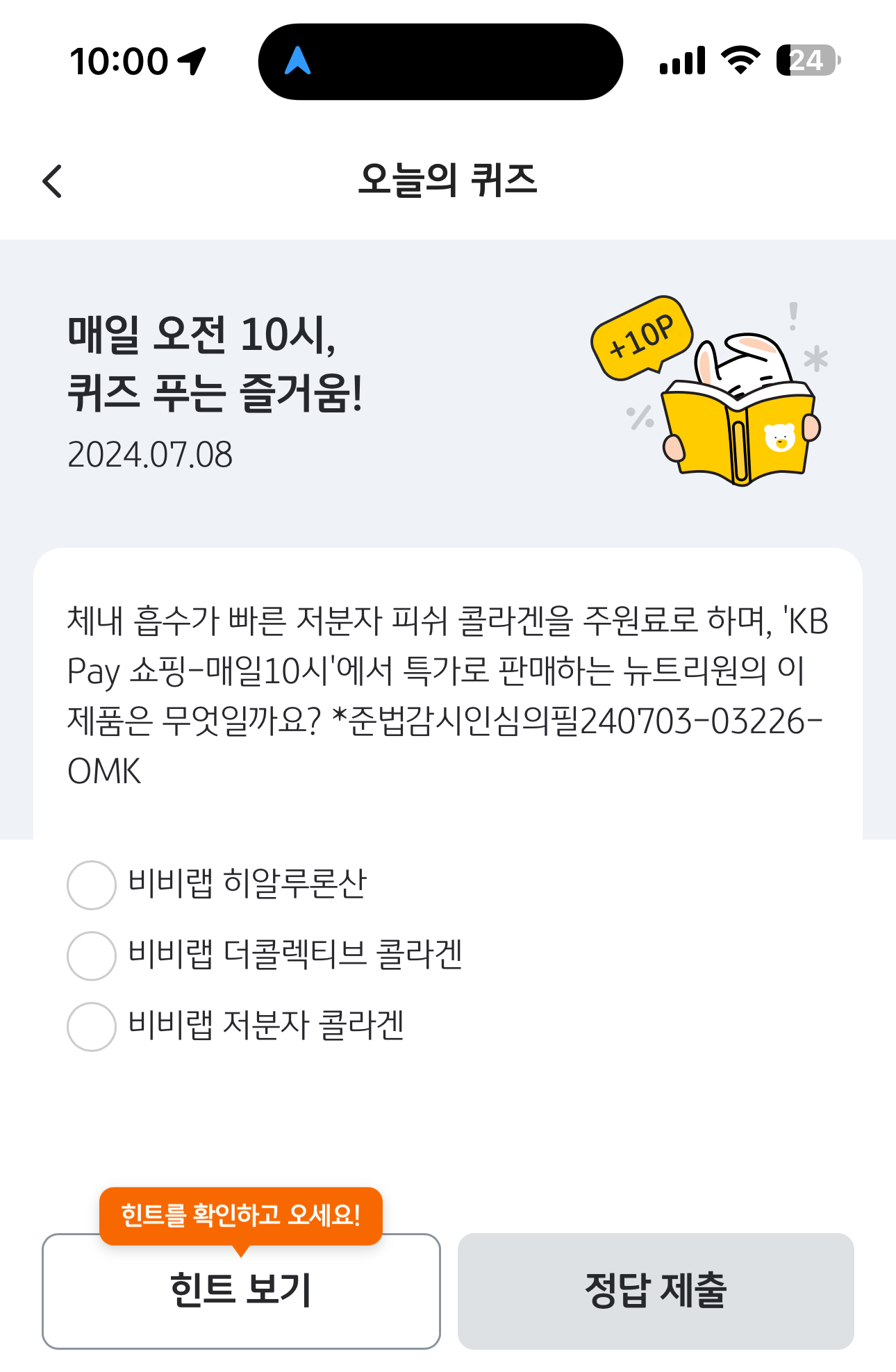 KB Pay 오늘의 퀴즈 7월 8일 정답(체네 흡수가 빠른 저분자 피쉬 콜라겐을 주원료로 하며, 'KB Pay 쇼핑-매일10시'에서 특가로 판매하는 뉴트리원의 이 제품은 무엇일까요?)