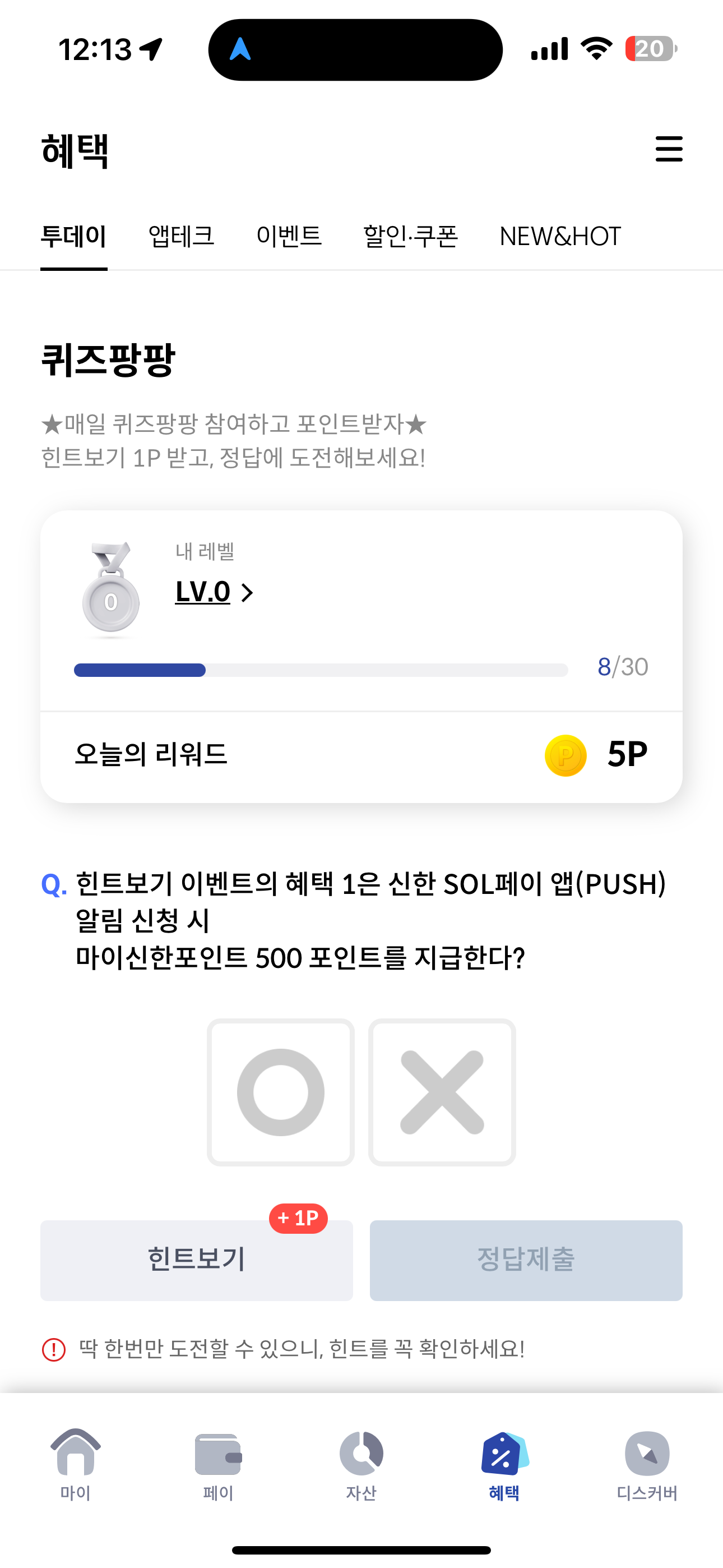 힌트보기 이벤트의 혜택 1은 신한 SOL페이 앱(PUSH) 알림 신청 시 마이신한포인트 500 포인트를 지급한다? O, X 퀴즈인데요. 신한 SOL페이 앱에서 알림을 신청하면 마이신한포인트를 제공하고 있습니다. 알림만 받아도 현금처럼 사용할 수 있는 포인트를 받으니 꼭 해두세요