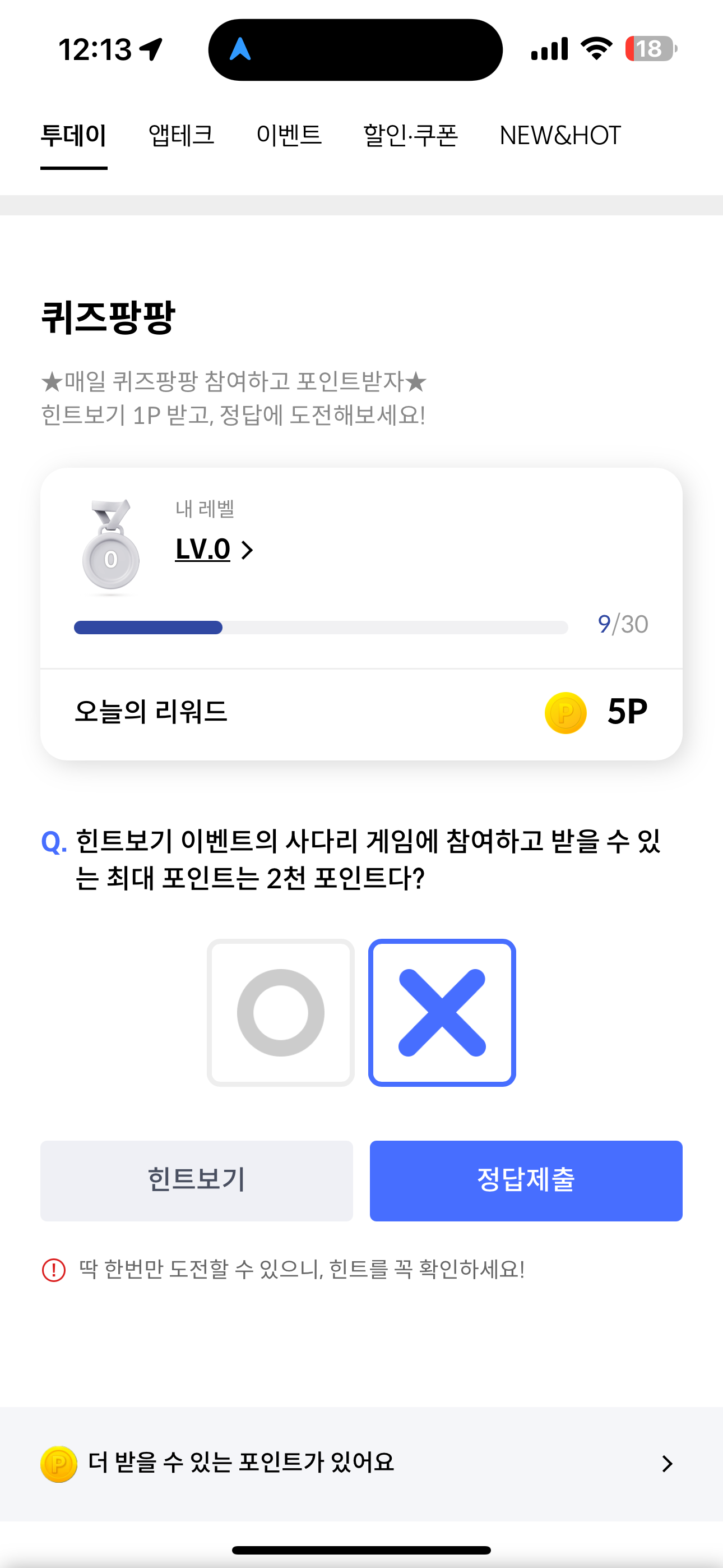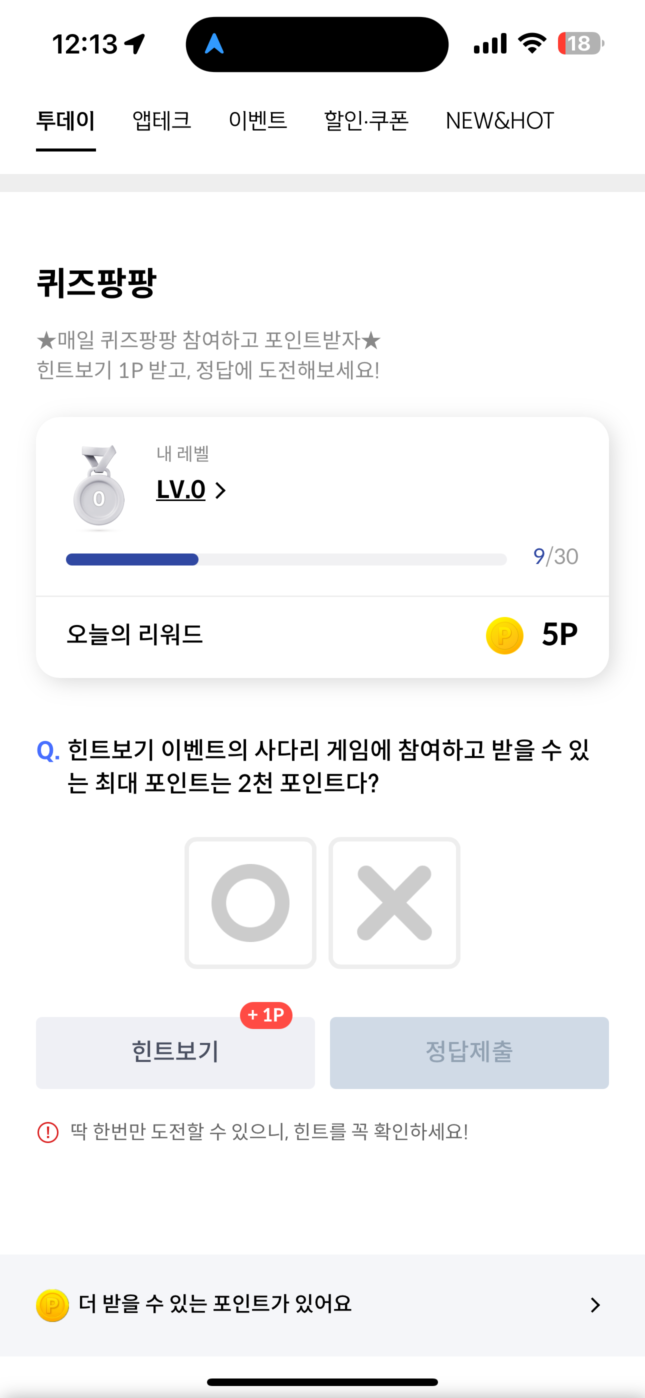 힌트보기 이벤트의 사다리 게임에 참여하고 받을 수 있는 최대 포인트는 2천 포인트다? O, X 퀴즈인데요. 사다리 게임에 참여하면 포인트를 랜덤으로 받을 수 있습니다. 운이 좋으면 크게 포인트를 받아 현금처럼 사용 가능한데요. 과연 최대 포인트는 얼마나 될까요?