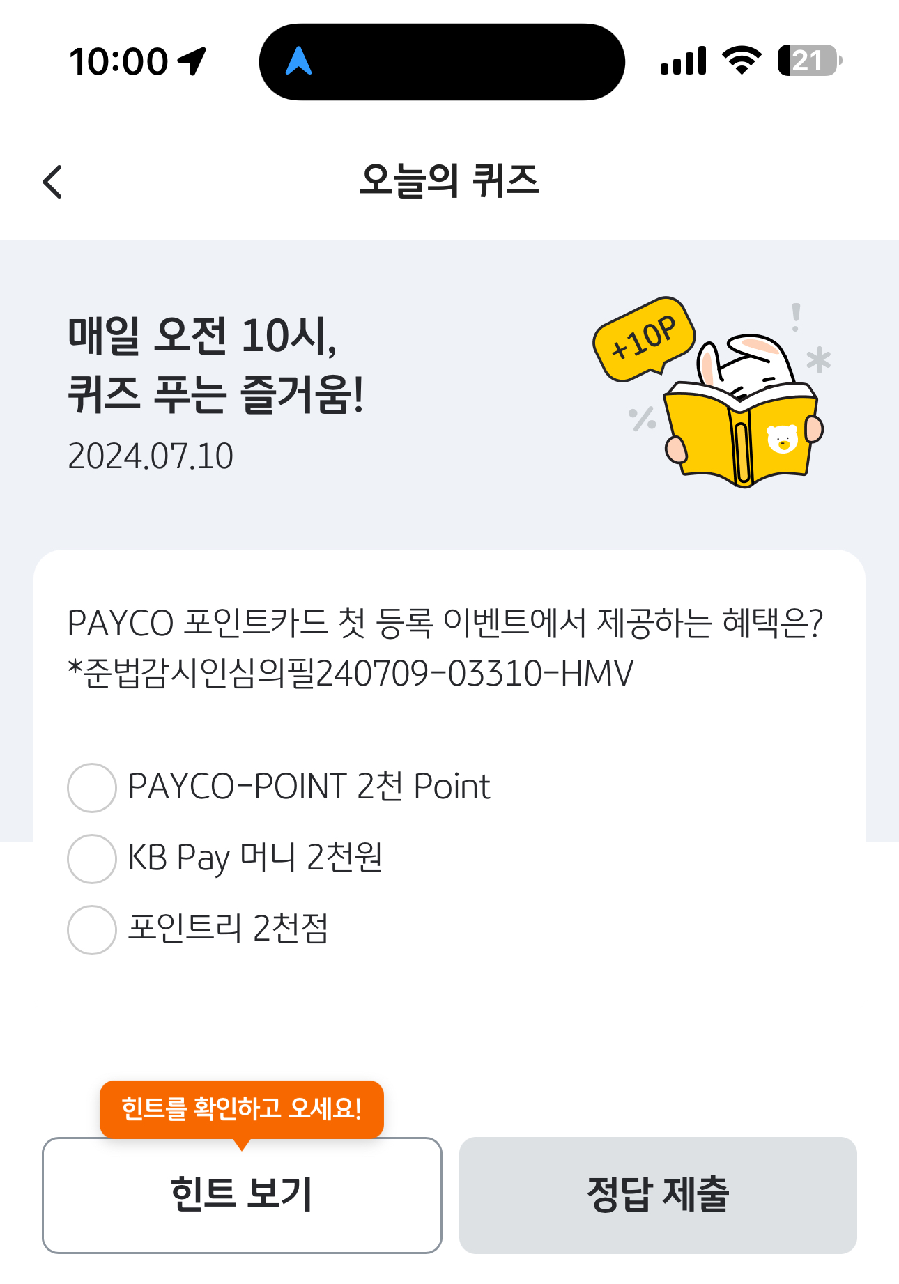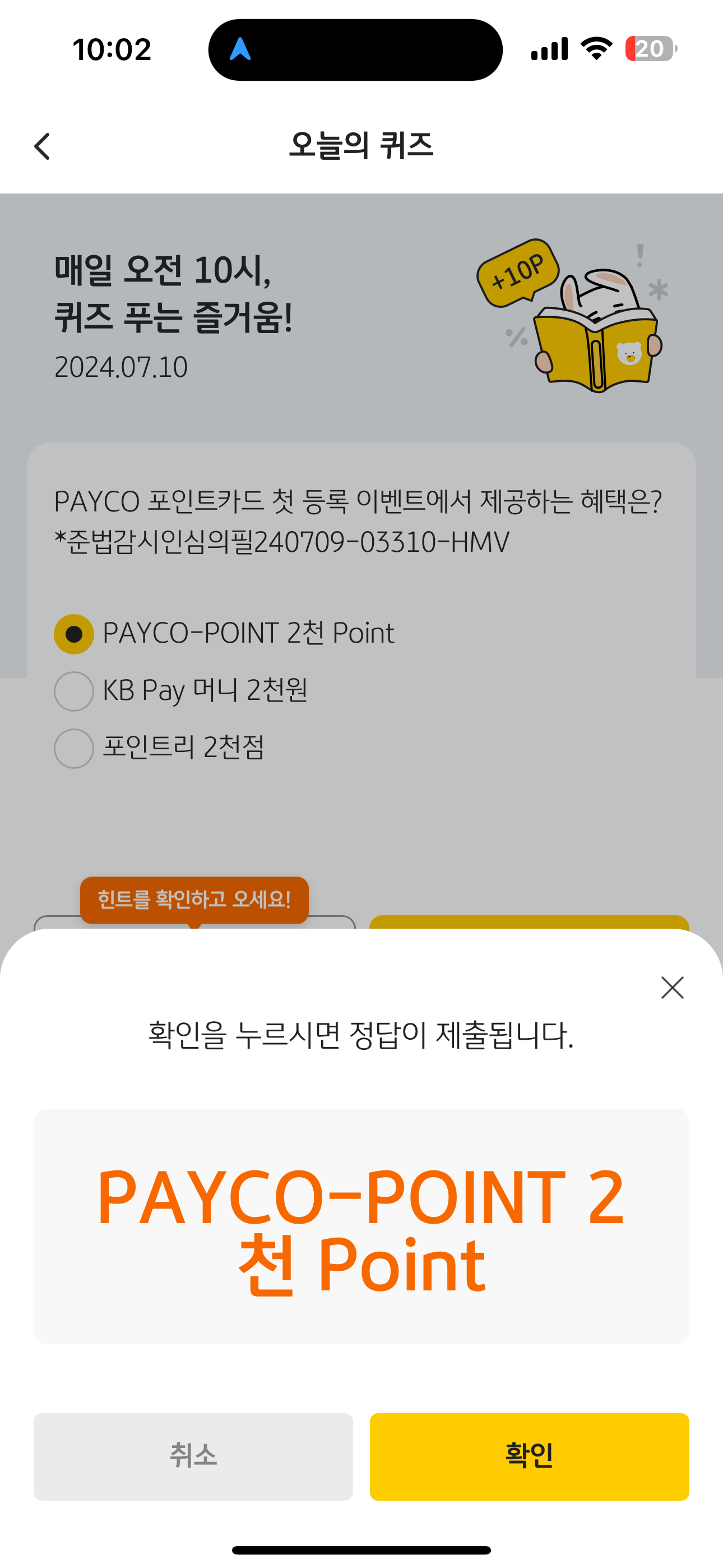KB Pay 오늘의 퀴즈 정답은 PAYCO-POINT 2천 Point 입니다
