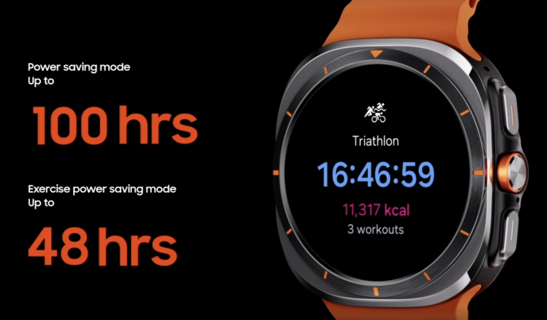 갤럭시워티 울트라는 보다 더 긴 배터리 수명을 가지고 있습니다. 절전 모드일 경우 최대 100시간 가능하고 운동 중 절전모드에서는 최대 48시간 사용이 가능합니다.