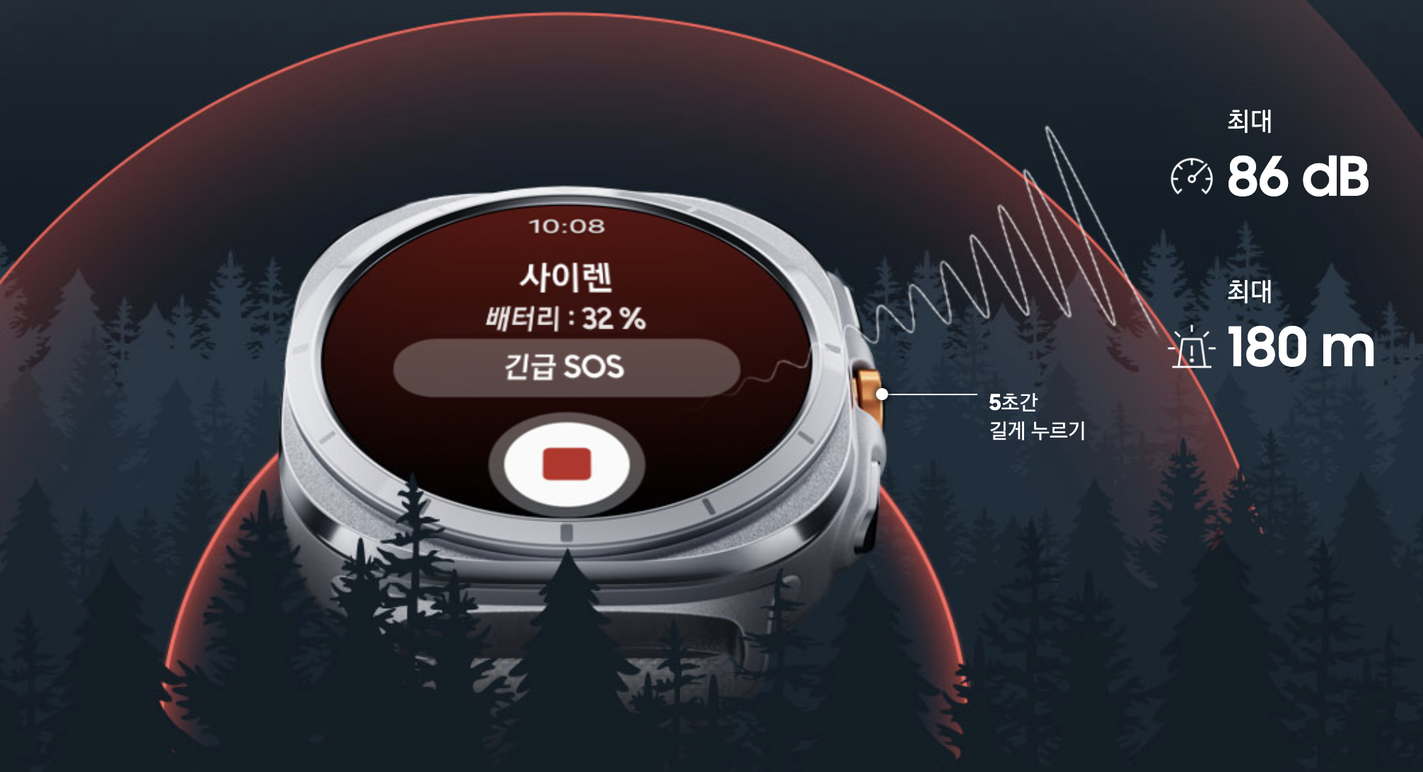 갤럭시워치 울트라는 측면에 있는 퀵 버튼을 이용해 빠르게 운동 측정을 시작할 수 있고 다음 코스로 넘기기 등 쉽게 운동을 제어할 수 있습니다. 그리고 버튼을 5초 이상 누르면 사용자의 안전을 위한 비상 사이렌이 작동됩니다.