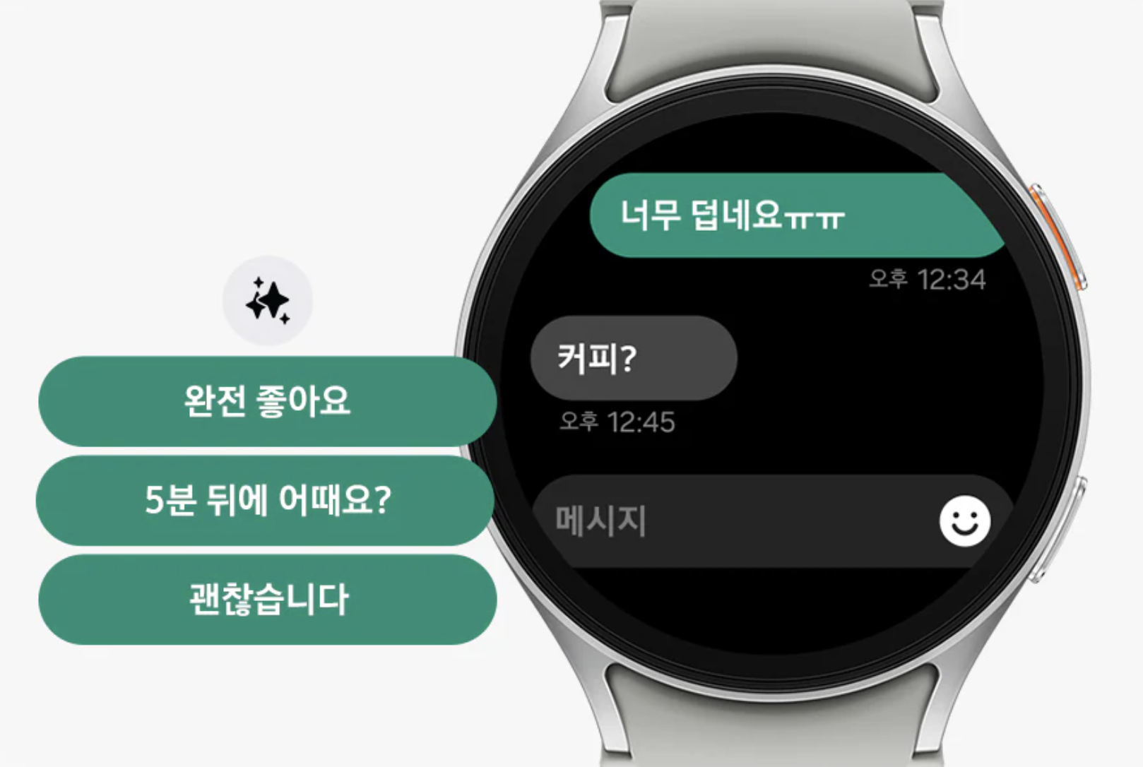 삼성 갤럭시워치7, 갤럭시워치 울트라는 AI가 이전 대화의 맥락을 분석해 적절한 답변을 제안하는 답장 추천 기능을 지원합니다. 알림 화면에서 더욱 쉬운 메시지 응답을 할 수 있습니다.