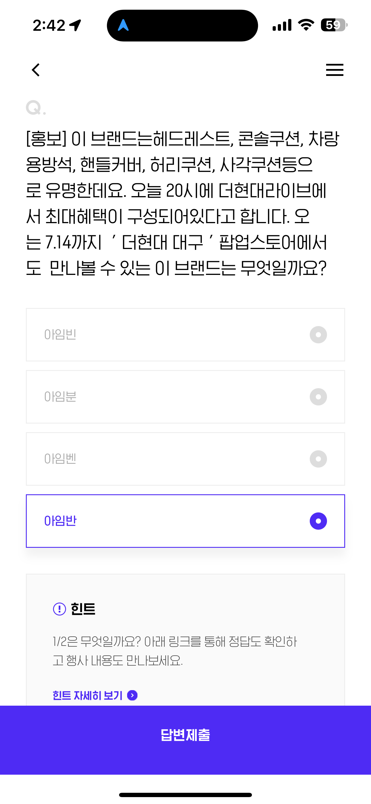 [홍보] 이 브랜드는헤드레스트, 콘솔쿠션, 차랑용방석, 핸들커버, 허리쿠션, 사각쿠션등으로 유명한데요. 오늘 20시에 더현대라이브에서 최대혜택이 구성되어있다고 합니다. 오는 7.14까지 ' 더현대 대구 ' 팝업스토어에서도 만나볼 수 있는 이 브랜드는 무엇일까요? 보기는 1. 아임빈 2. 아임분 3. 아임벤 4. 아임반 입니다