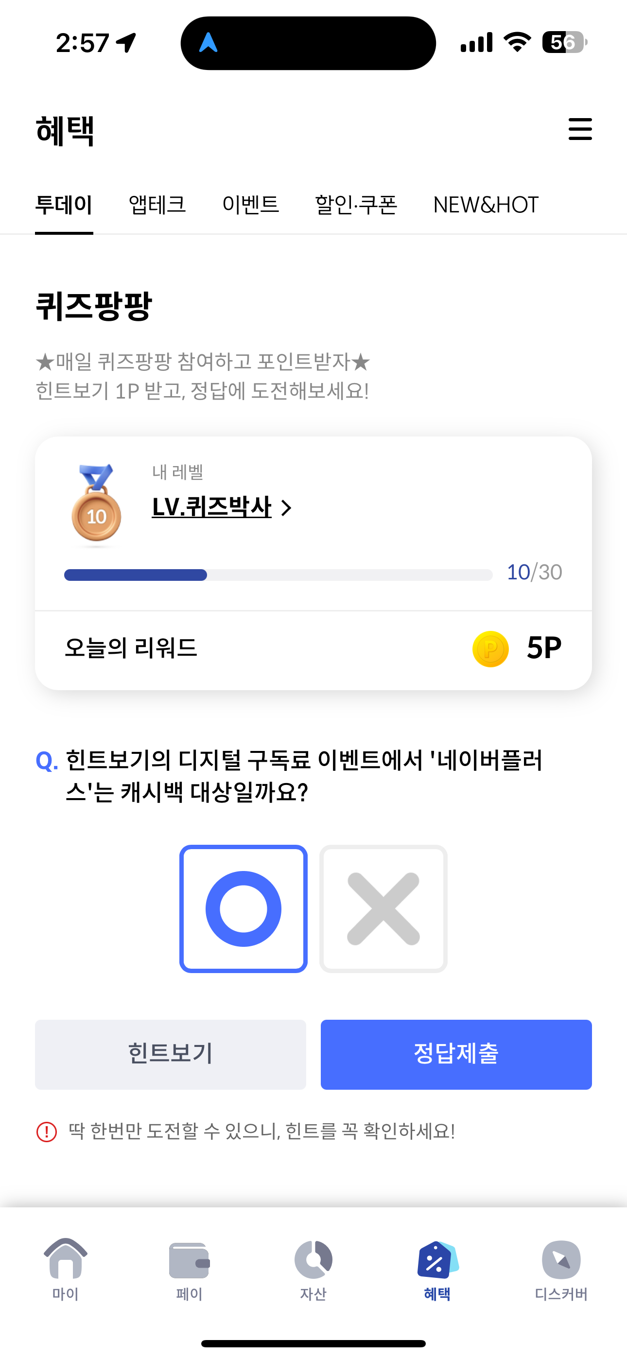 힌트보기의 디지털 구독료 이벤트에서 '네이버플러스'는 캐시백 대상일까요? O,X 퀴즈인데요. 신한카드는 요즘 대세가 된 다양한 디지털 구독료를 캐시백으로 돌려주는 이벤트를 열고 있습니다. 넷플릭스, 디즈니플러스 등 어떤 곳들이 있는지 확인해 보시고 꼭 혜택 받으세요