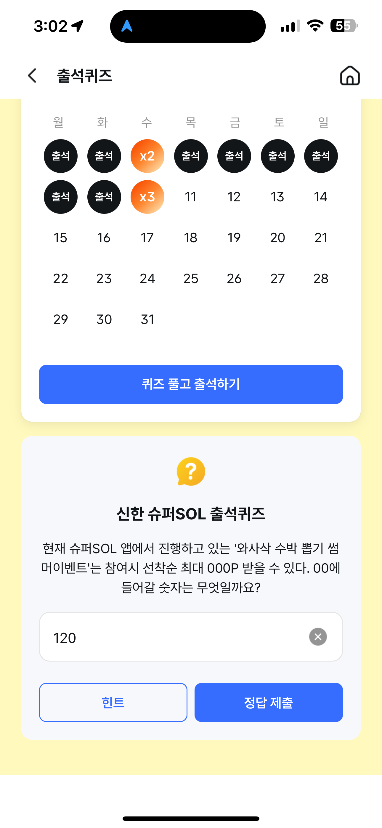신한 슈퍼SOL 출석퀴즈 정답은 120 입니다