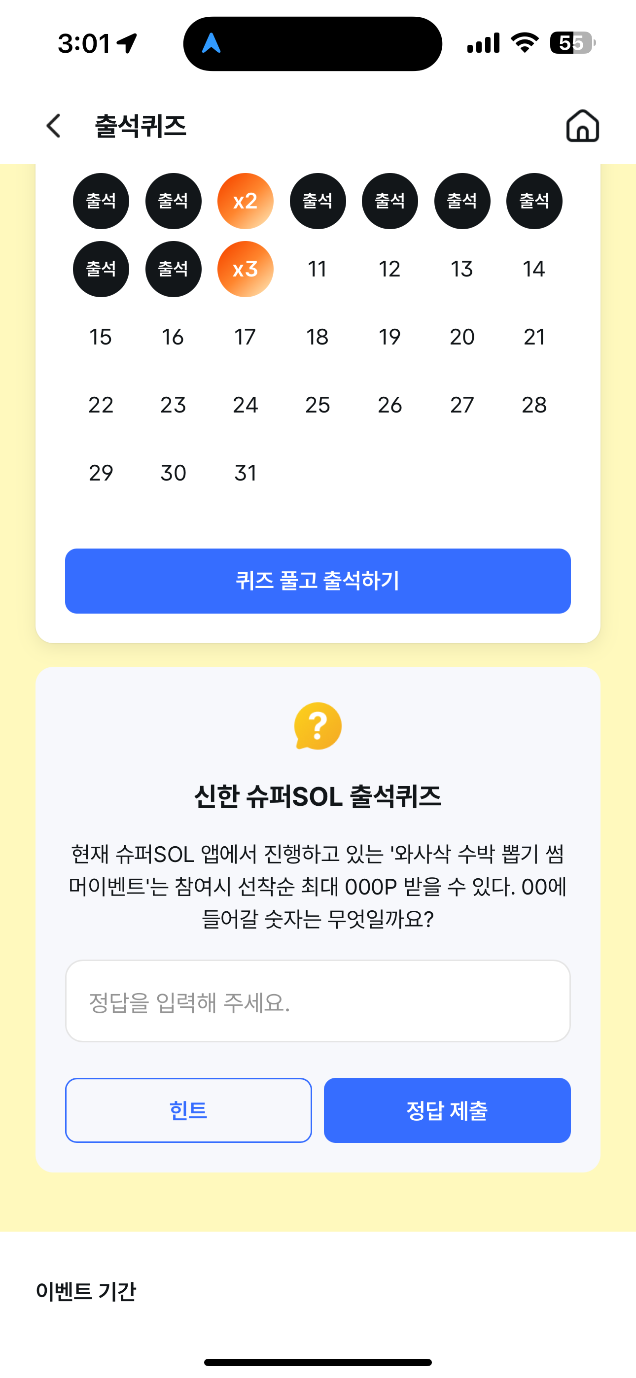 현재 슈퍼SOL 앱에서 진행하고 있는 '와사삭 수박 뽑기 썸머이벤트'는 참여시 선착순 최대 000P 받을 수 있다. 00에 들어갈 숫자는 무엇일까요? 주관식 퀴즈인데요. 슈퍼SOL에는 다양한 이벤트가 진행되고 있는데요. 선착순으로 포인트를 받을 수 있습니다. 놓치지말고 해보세요