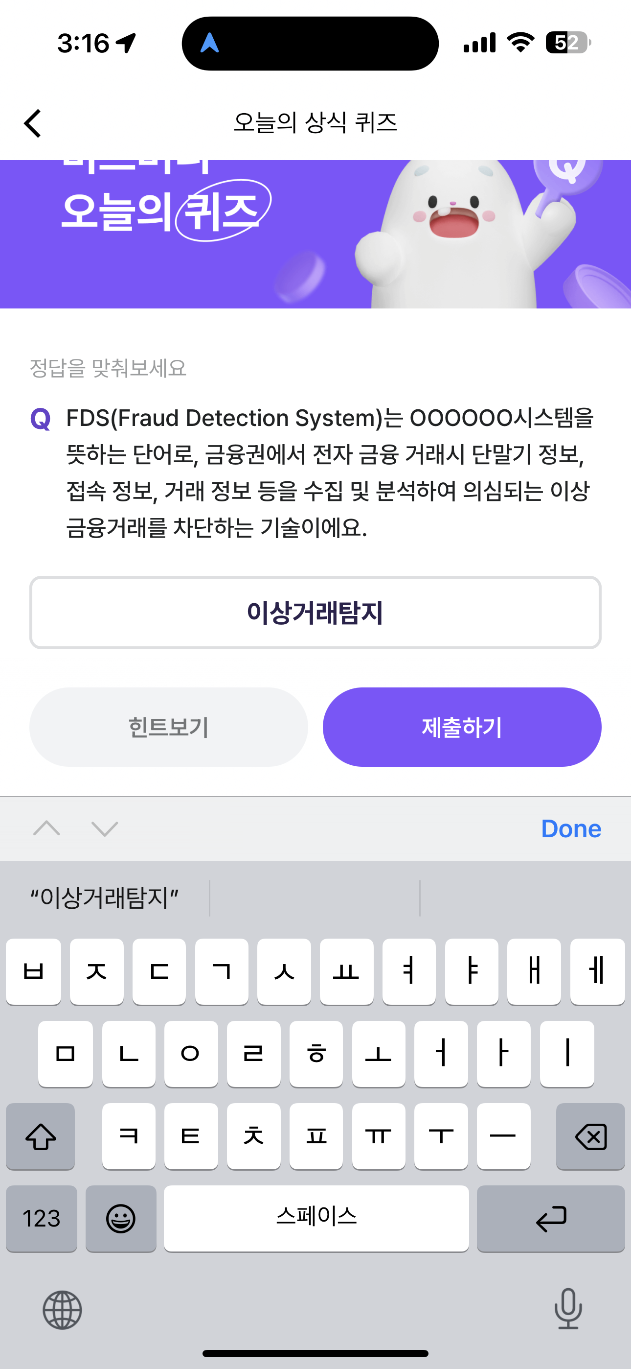 FDS(Fraud Detection System)는 OOOOOO시스템을 뜻하는 단어로, 금융권에서 전자 금융 거래시 단말기 정보, 접속 정보, 거래 정보 등을 수집 및 분석하여 의심되는 이상금융거래를 차단하는 기술이에요. 주관식 퀴즈인데요.