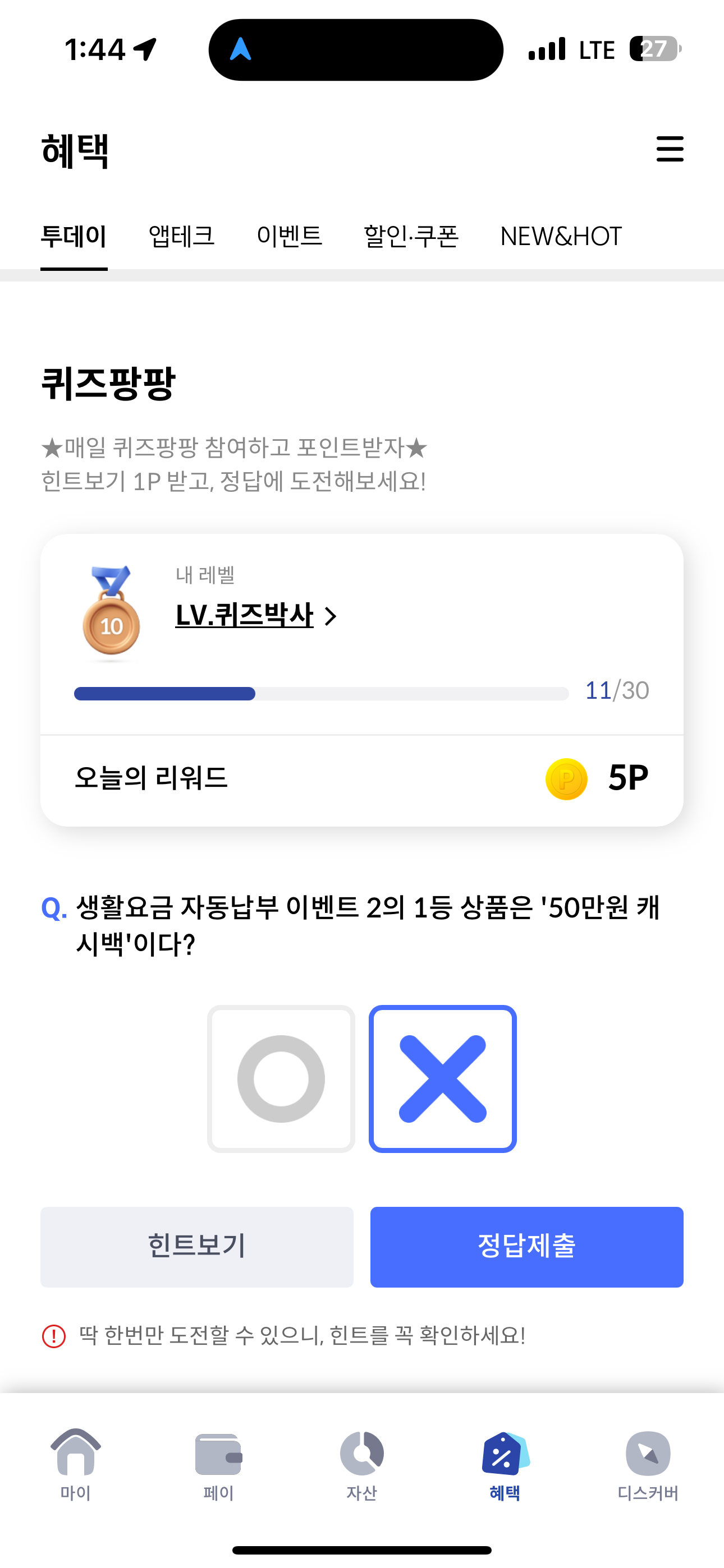 신한카드 퀴즈팡팡 정답은 X 입니다