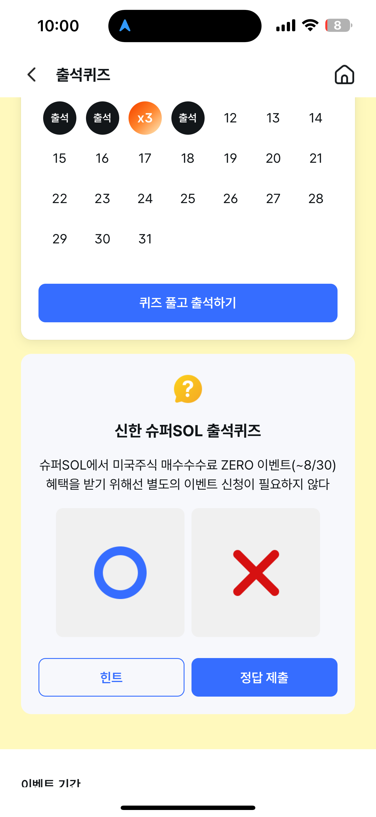 신한 슈퍼SOL 출석퀴즈 정답은 O 입니다