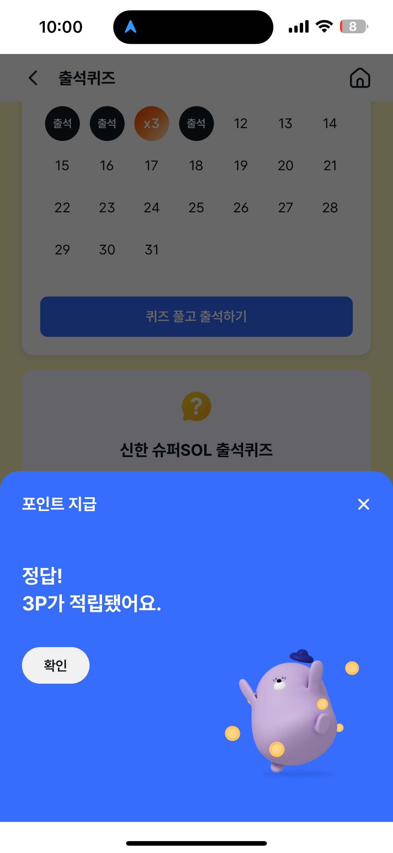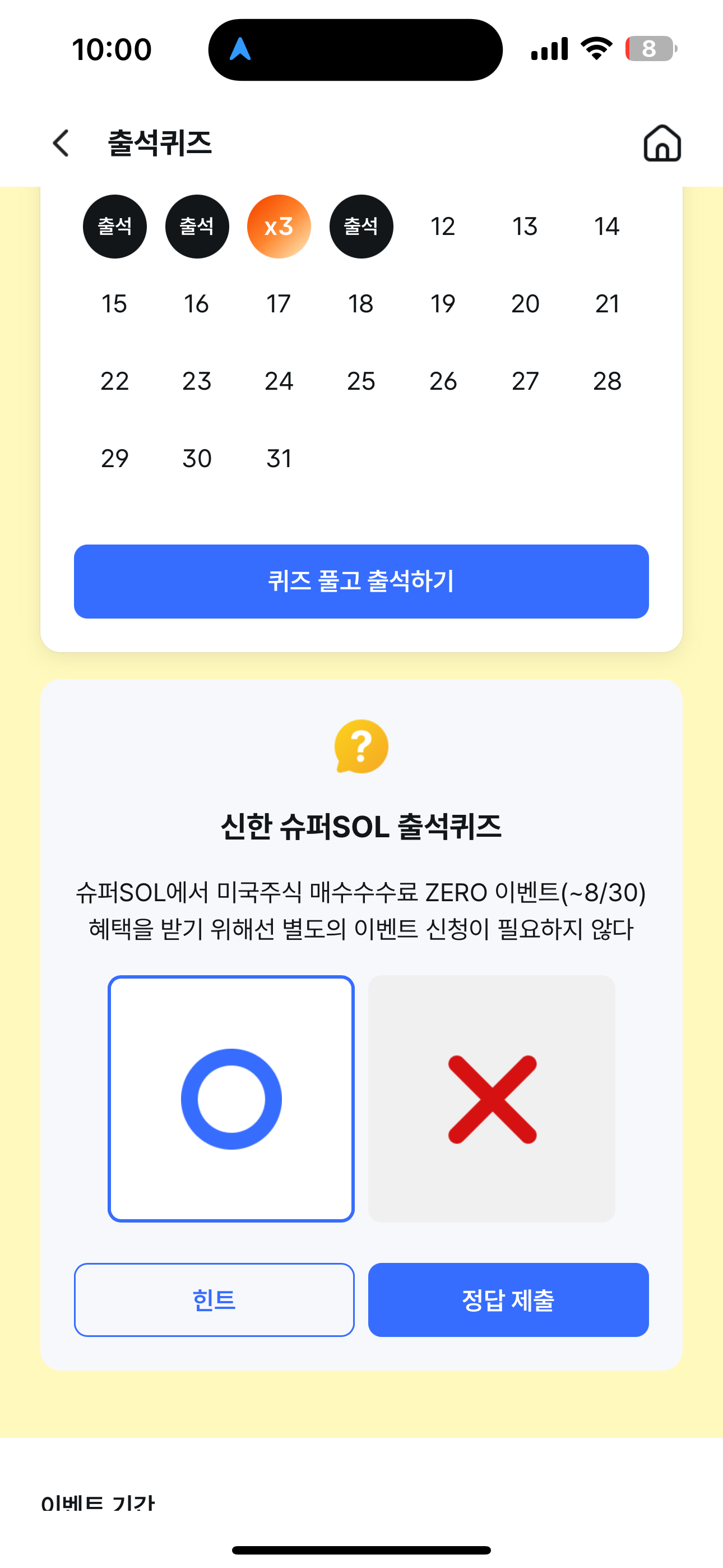 신한 슈퍼SOL 출석퀴즈 정답은 O 입니다