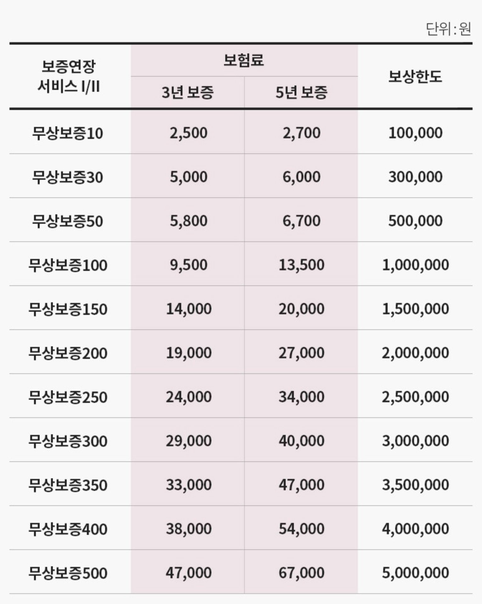 쿠팡에서는 최대 5년의 보증기간을 연장할 수 있는 서비스를 제공합니다. 서비스 보상 한도에 따라 선택이 가능하니 필요한 분들은 참고해서 이용하시면 됩니다. 보험료는 한번만 내면 되는 건데요. 의외로 저렴합니다.