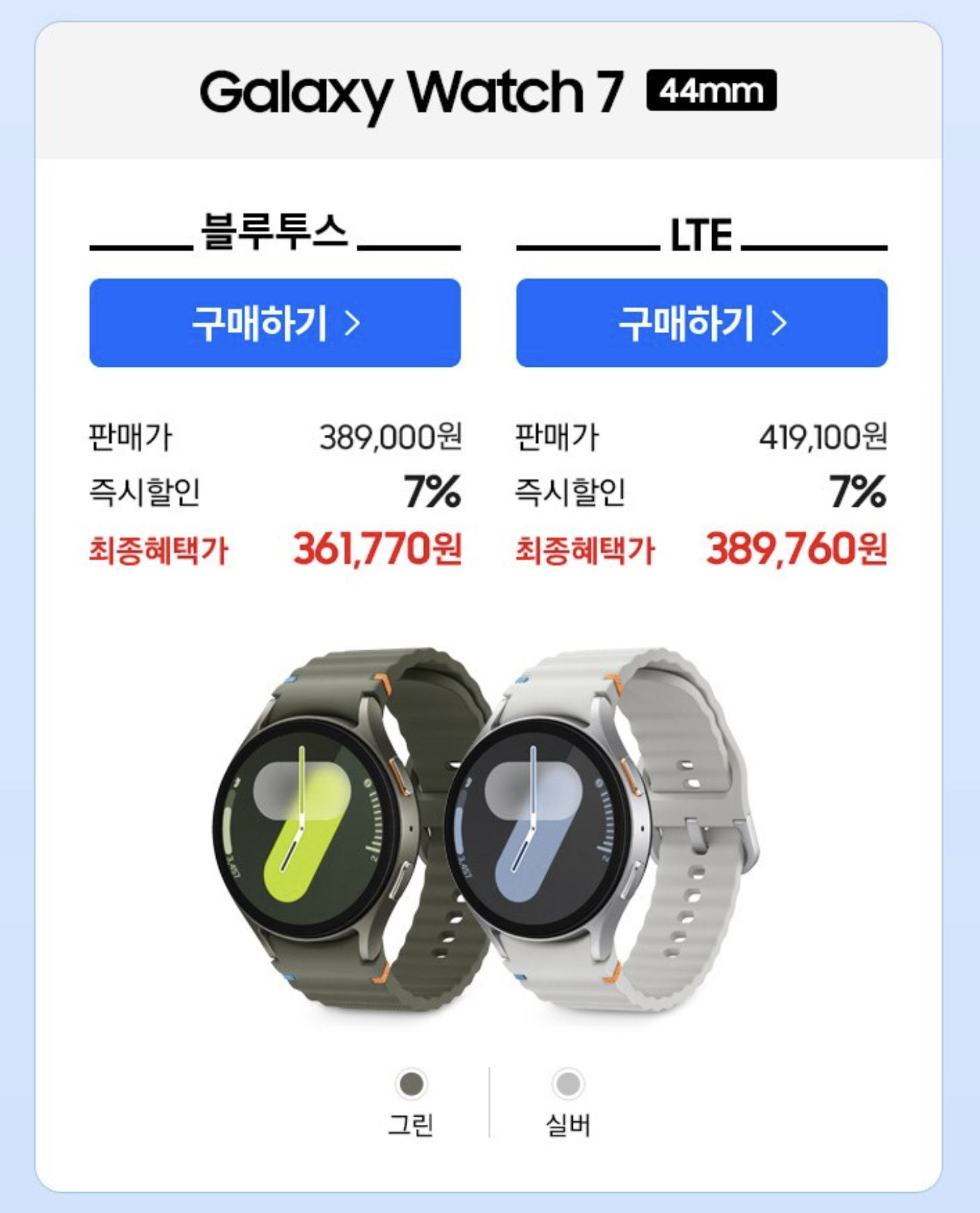쿠팡 삼성 갤럭시워치7 44mm 블루투스 가격은 7% 가격 할인을 받아 361,770원에 구입 가능합니다. 삼성 갤럭시워치7 44mm LTE 가격은 389,760원 입니다. 마찬가지로 가격 차가 크지 않으니 이왕이면 LTE 모델이 좋습니다.