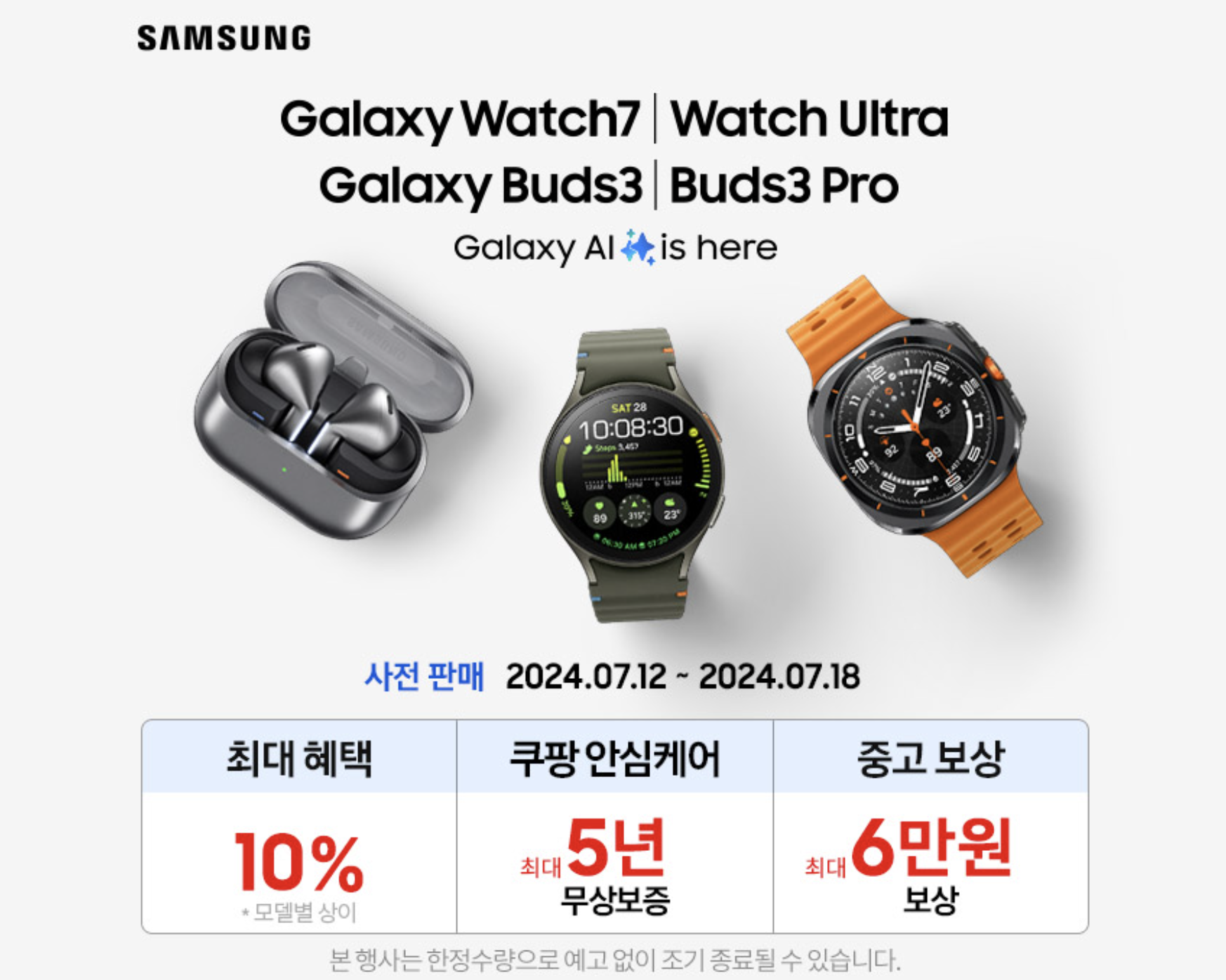쿠팡 삼성 갤럭시워치7, 갤럭시워치 울트라 사전예약 혜택으로 10% 가격 할인, 쿠팡 안심케어 최대 5년 무상보증, 중고보상 최대 4만원 혜택이 제공됩니다.