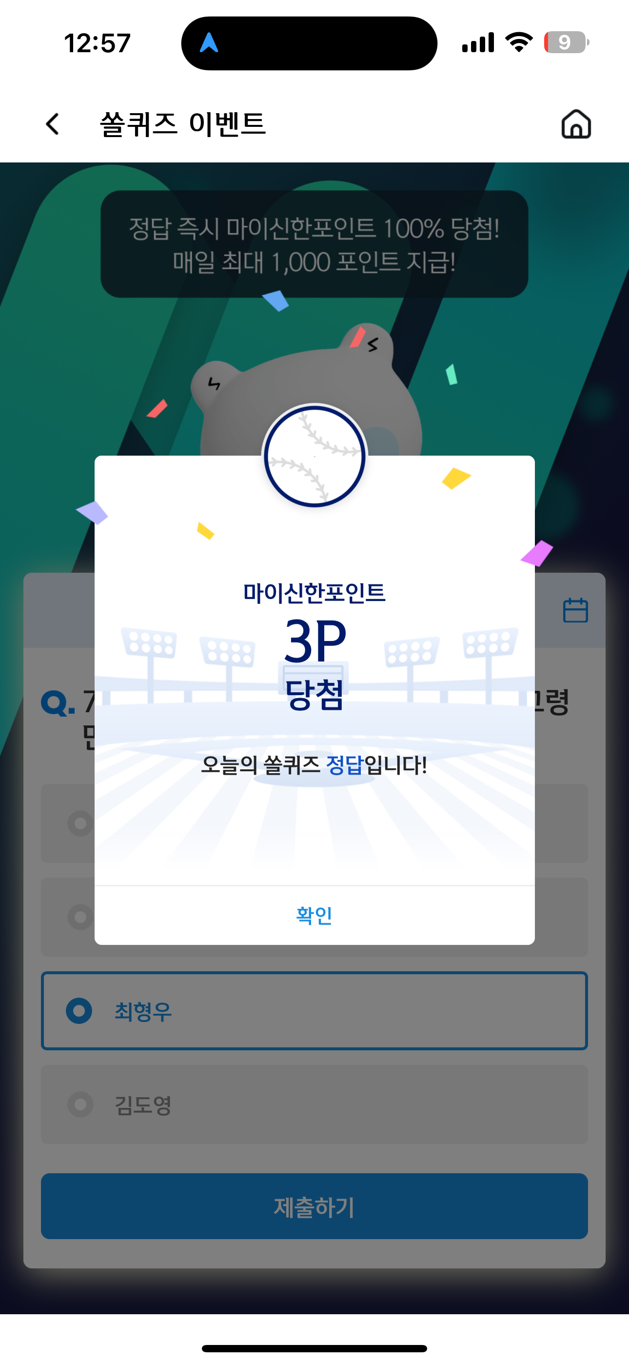 신한 슈퍼SOL 야구/상식 쏠퀴즈 정답은 최형우 입니다