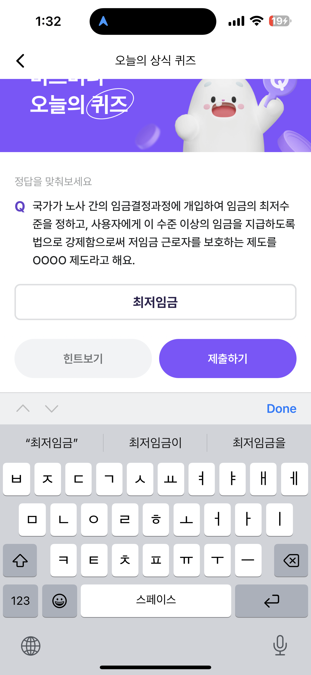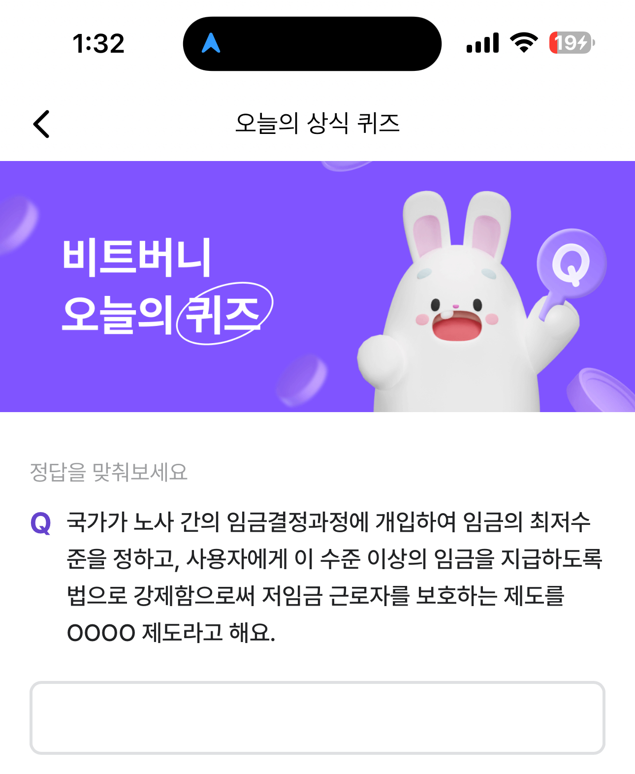 비트버니 오늘의 퀴즈 7월 16일 ㅊㅈㅇㄱ정답(국가가 노사 간의 임금결정과정에 개입하여 임금의 최저수준을 정하고, 사용자에게 이 수준 이상의 임금을 지급하도록 법으로)
