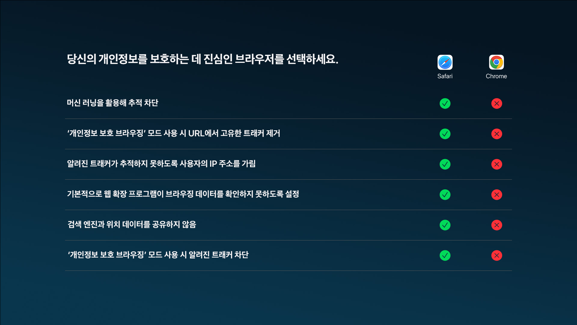 그리고 사파리는 사용자의 IP주소를 파악해 알려진 트래커가 사용자를 추적하지 못하게도 해줍니다. IP주소는 사용자를 식별하고 사용자의 위치를 드러낼 수 있는 정보입니다. 다른 브라우저는 별도 설정을 통해 추적 방지 기능을 설정해야 하지만 사파리는 기본적으로 활성화되어 있습니다.