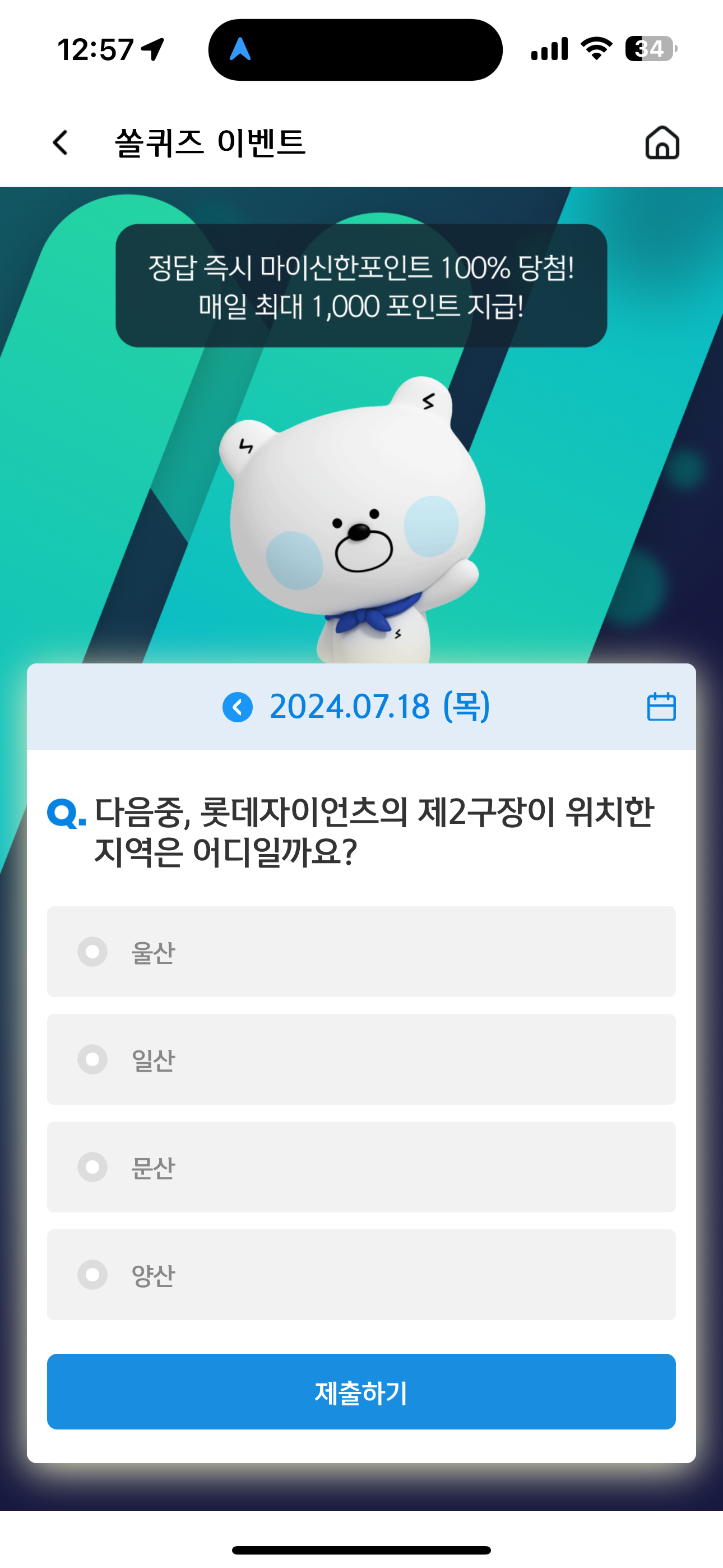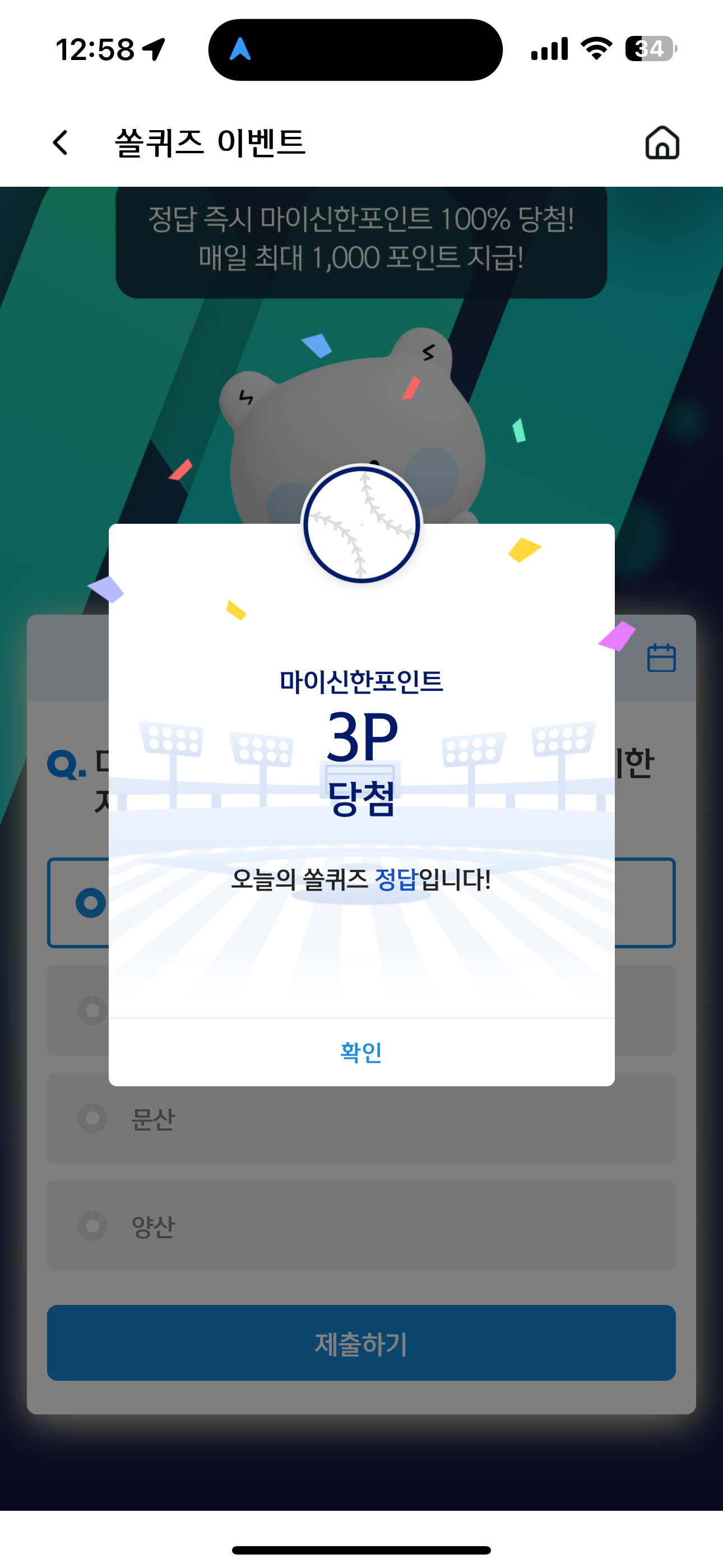신한 슈퍼SOL 야구/상식 쏠퀴즈 정답은 울산 입니다