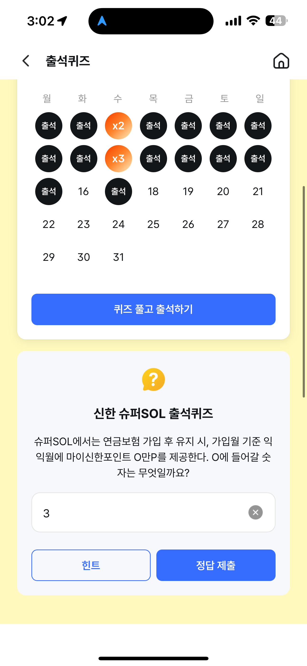 신한 슈퍼SOL 출석퀴즈 정답은 3 입니다