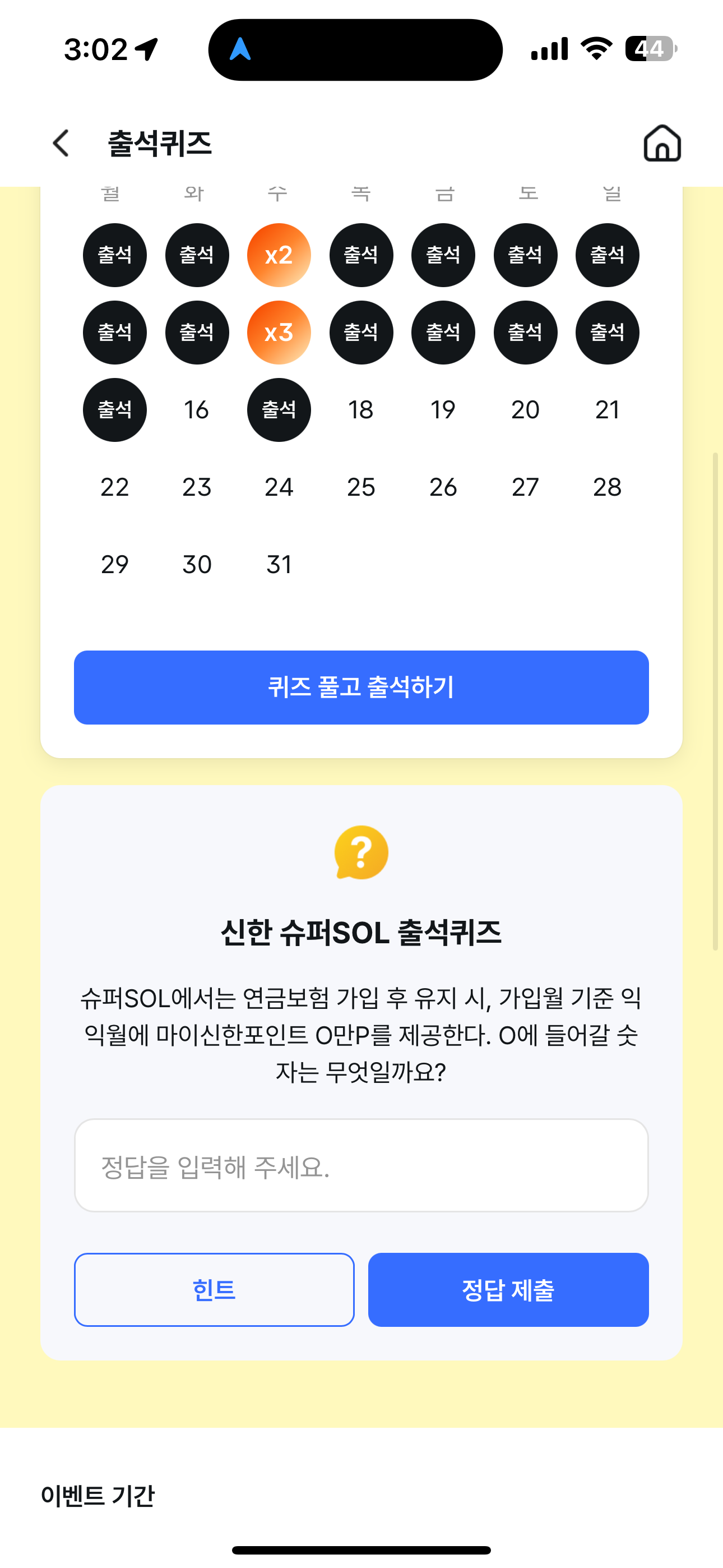 신한 슈퍼SOL 출석퀴즈 정답은 3 입니다