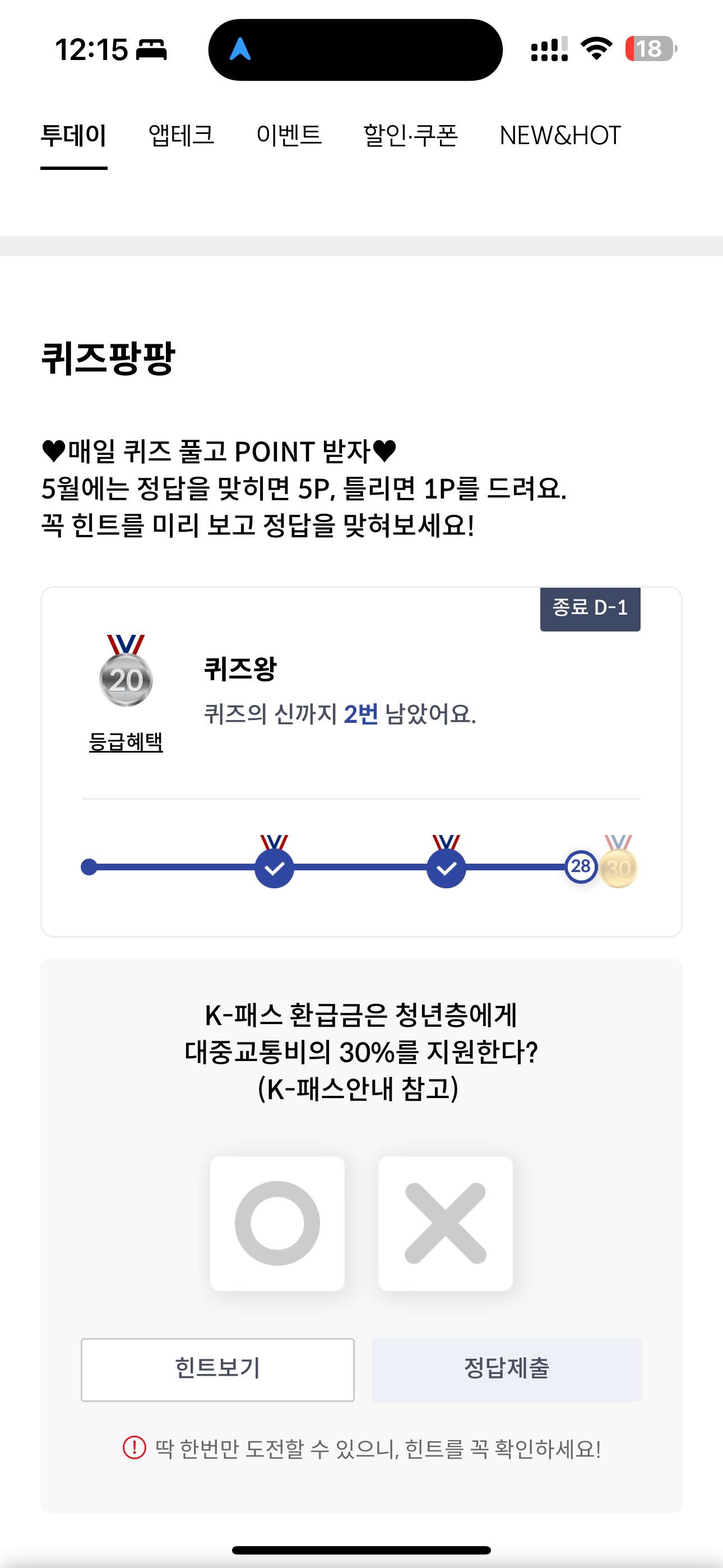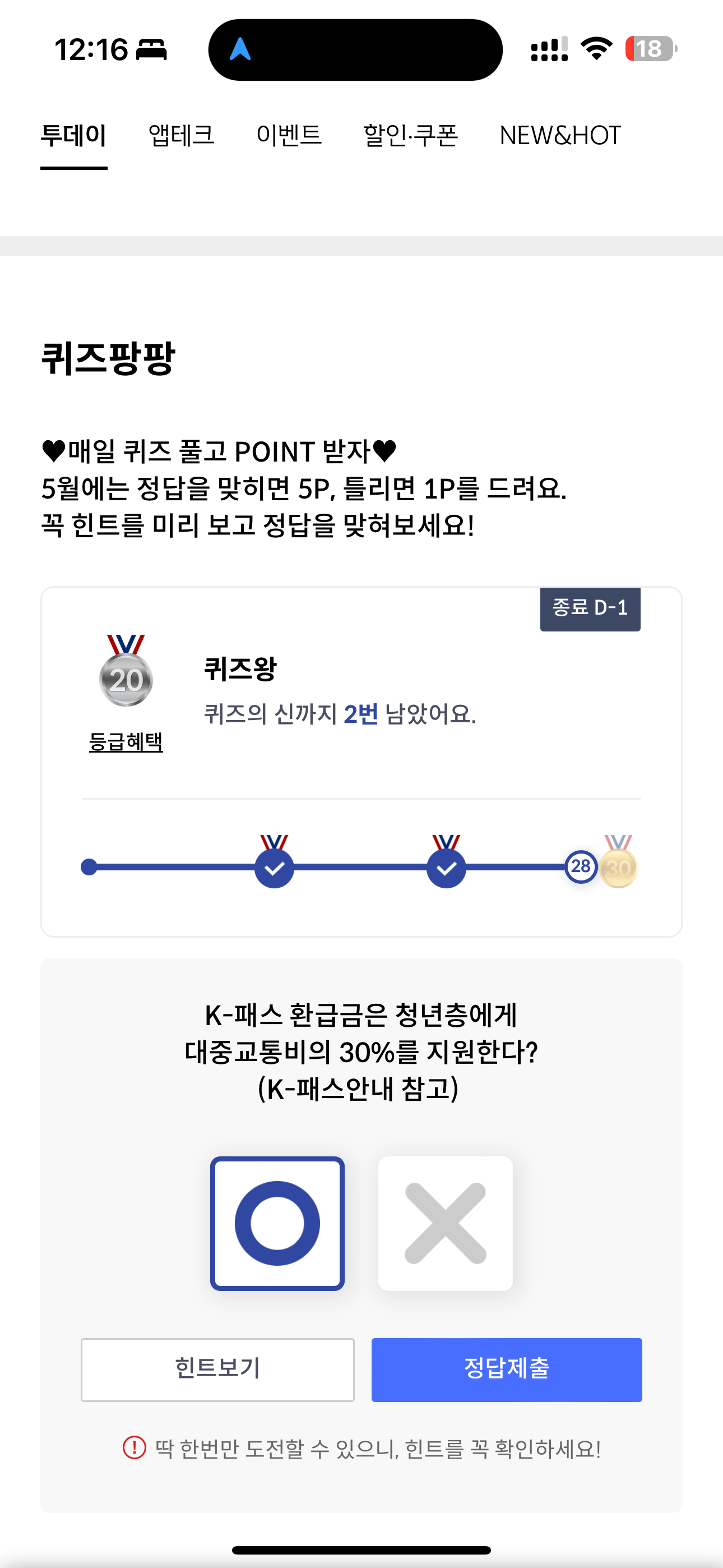 K-패스 환급금은 청년층에게 대중교통비의 30%를 지원한다 (K-패스안내 참고) O, X 퀴즈인데요. 현재 K-패스 인기가 뜨겁죠. 대중교통비를 환급해줘 경제적으로 많은 보탬이 되고 있는데요. 특히 청년층은 할인율을 더욱 높여 큰 혜택을 주고 있으니 꼭 발급 받아 사용하세요.