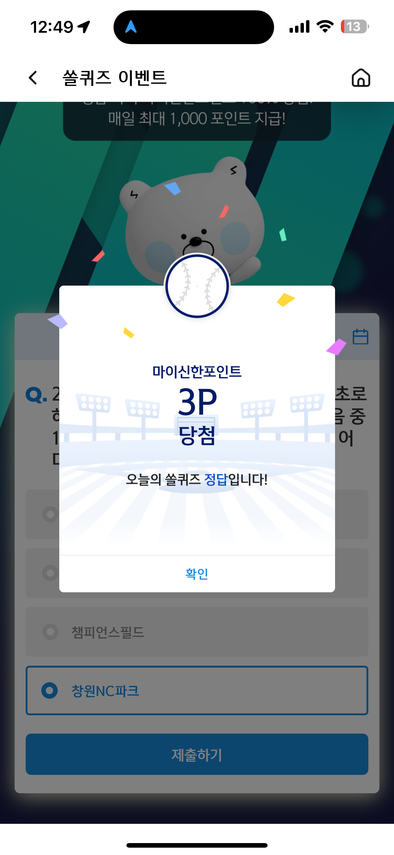 신한 슈퍼SOL 야구/상식 쏠퀴즈 정답은 창원NC파크 입니다