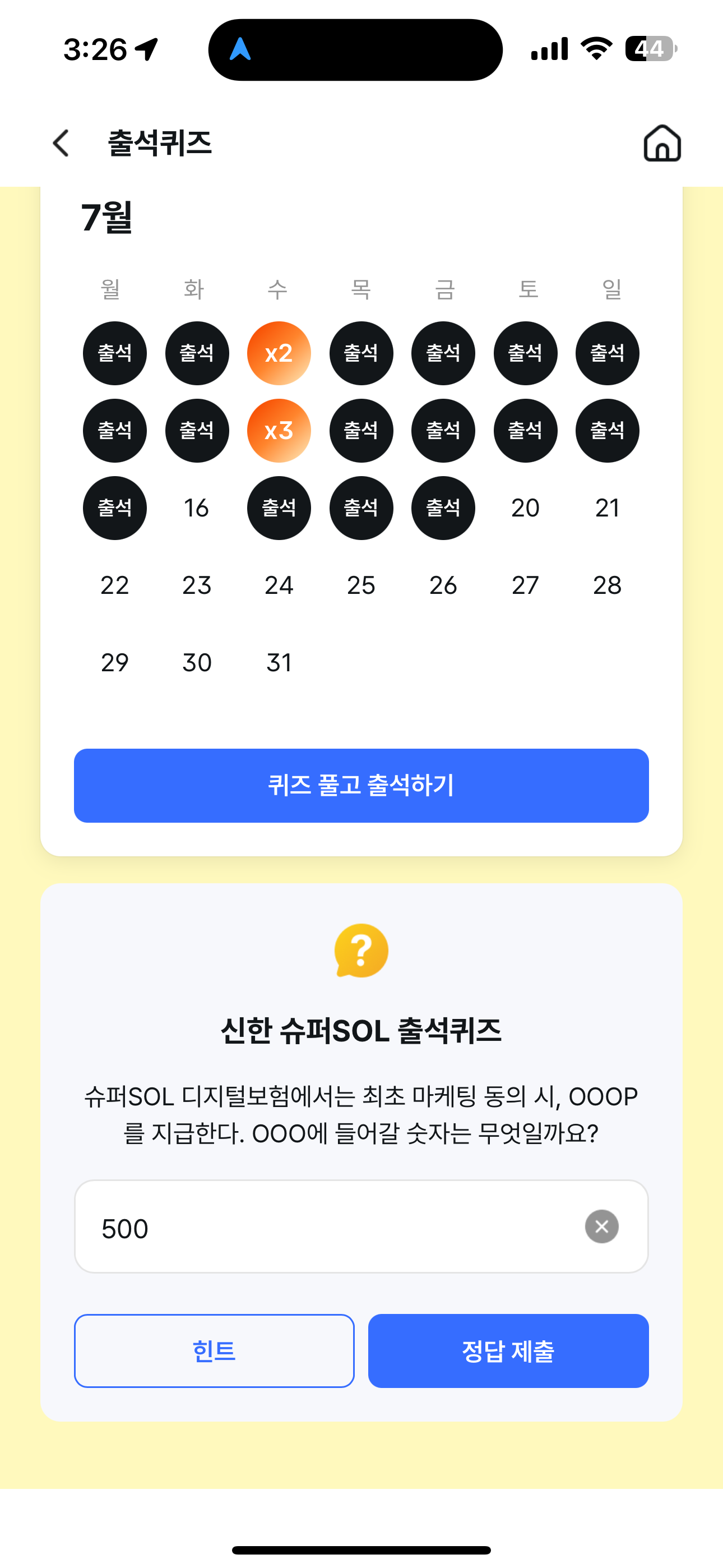 신한 슈퍼SOL 출석퀴즈 정답은 500 입니다