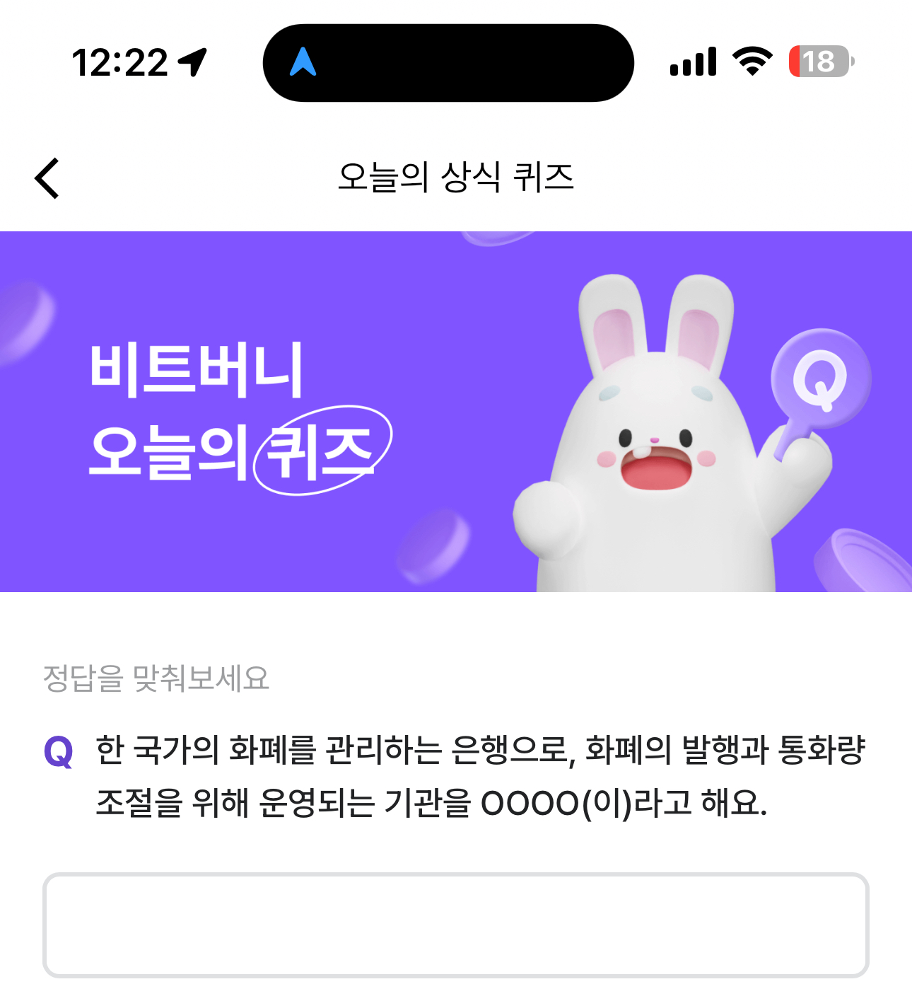 비트버니 오늘의 퀴즈 7월 21일 ㅈㅇㅇㅎ 정답(한 국가의 화폐를 관리하는 은행으로, 화폐의 발행과 통화량 조절을 위해 운영되는 기관을 OOOO(이)라고 해요)