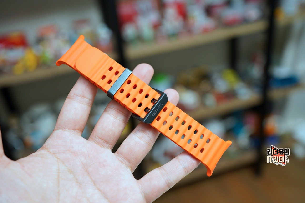 삼성 갤럭시워치 울트라 마린밴드입니다. 수영에 최적화된 밴드인데요. 여러가지 종류의 밴드가 있지만 이걸 강제하고 있습니다. 그리고 갤럭시워치 울트라 티타늄 그레이는 오렌지 색상의 마린 밴드가 들어 있습니다.