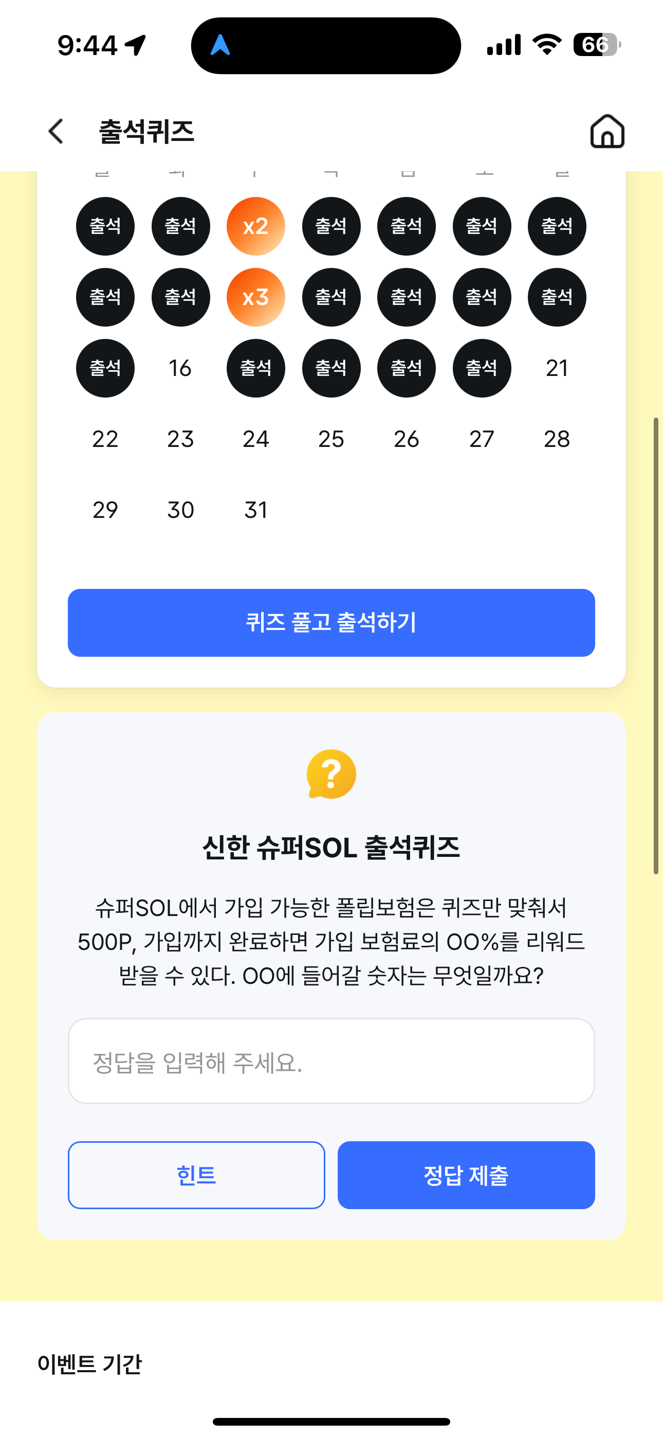 신한 슈퍼SOL 출석퀴즈 7월 21일 정답(슈퍼SOL에서 가입 가능한 플립보험은 퀴즈만 맞춰서 500P, 가입까지 완료하면 가입 보험료의 OO%를 리워드 받을 수 있다)