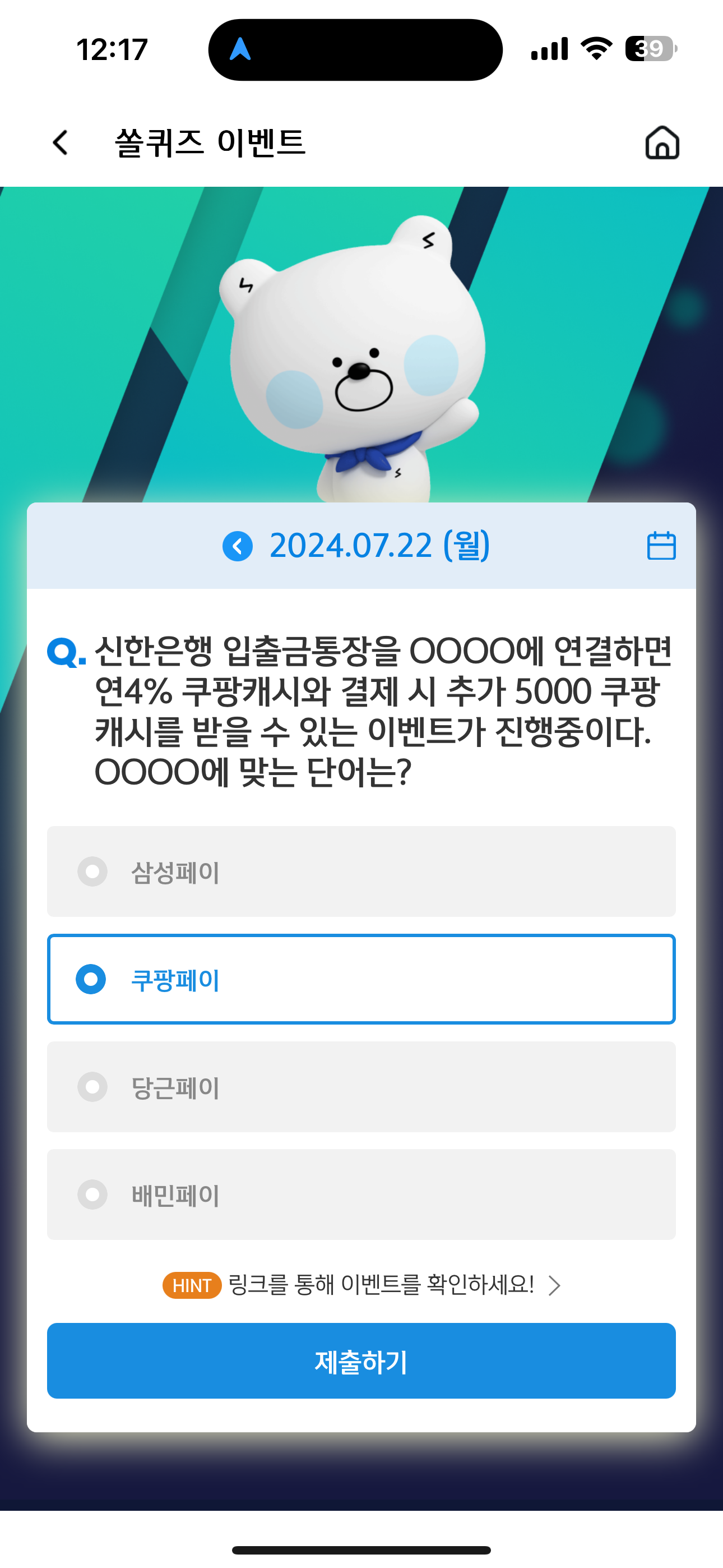 신한은행 입출금통장을 OOOO에 연결하면 연4% 쿠팡캐시와 결제 시 추가 5000 쿠팡 캐시를 받을 수 있는 이벤트가 진행중이다. OOOO에 맞는 단어는? 보기는 1. 삼성페이 2. 쿠팡페이 3. 당근페이 4. 배민페이 입니다. 혜택을 보면 당연히 한곳 밖에 없죠. 쿠팡 캐시를 받을 수 있는게 힌트입니다.