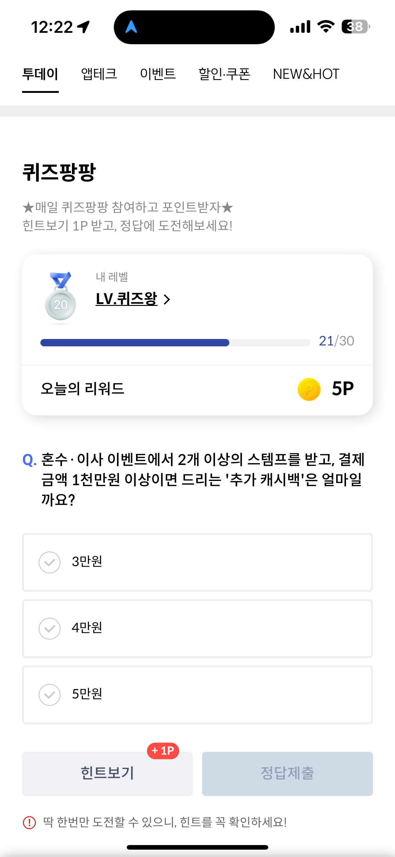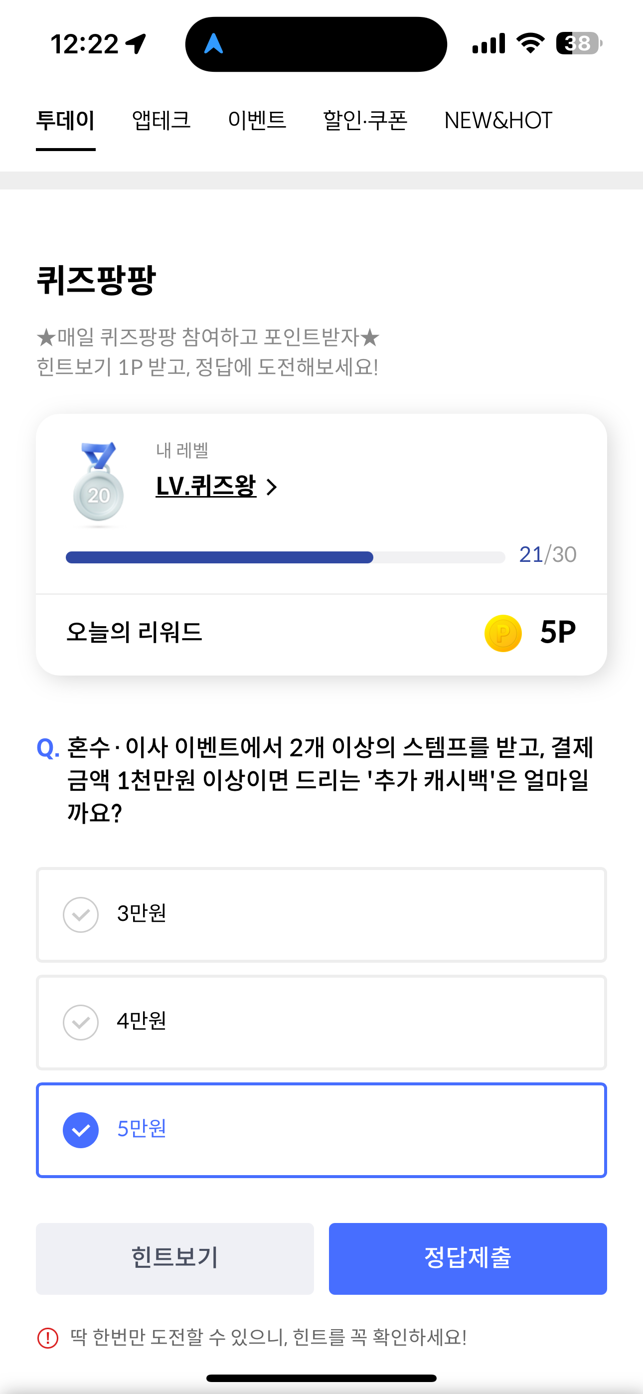 신한카드 퀴즈팡팡 정답은 5만원 입니다