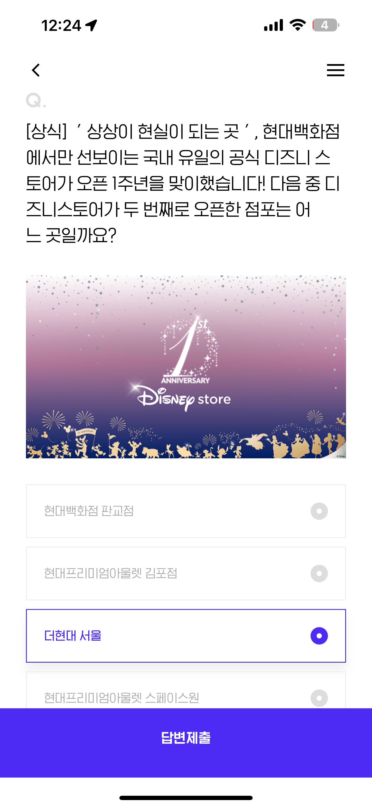 ' 상상이 현실이 되는 곳 ' ,현대백화점에서만 선보이는 국내 유일의 공식 디즈니 스토어가 오픈 1주년을 맞이했습니다! 다음 중 디즈니스토어가 두 번째로 오픈한 점포는 어느 곳일까요? 보기는 1. 현대백화점 판교점 2. 현대프리미엄아울렛 김포점 3. 더현대 서울 4. 현대프리미엄아울렛 스페이스원 입니다.
