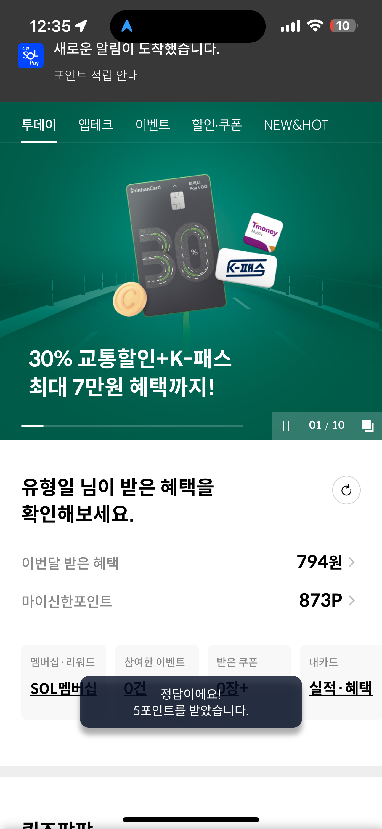 신한카드 퀴즈팡팡 정답은 500P 입니다
