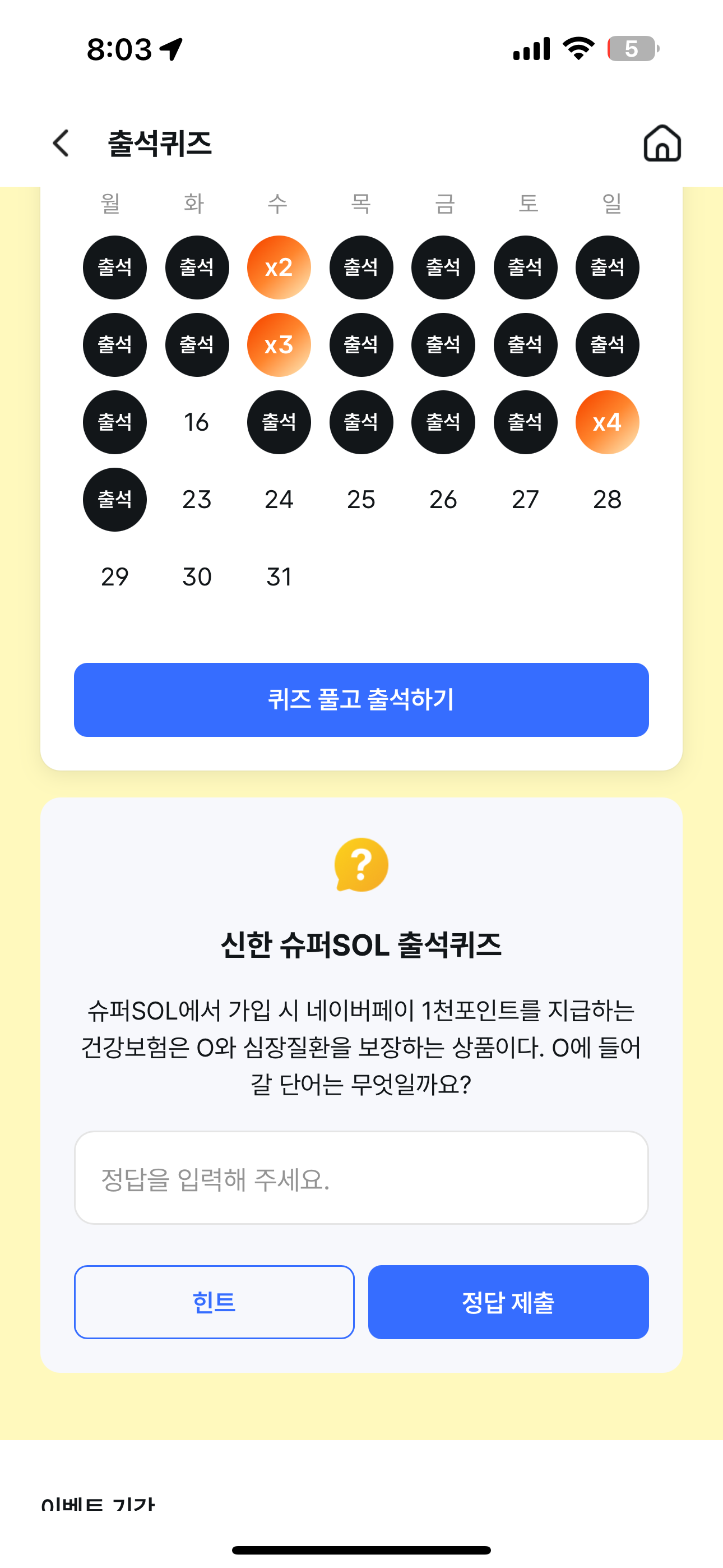 슈퍼SOL에서 가입 시 네이버페이 1천포인트를 지급하는 건강보험은 O와 심장질환을 보장하는 상품이다. O에 들어갈 단어는 무엇일까요? 주관식 퀴즈인데요. 슈퍼SOL에서는 다양한 보험 상품도 가입이 가능합니다. 꼭 필요한 건강관련 정보들이 있으니 확인해 보세요
